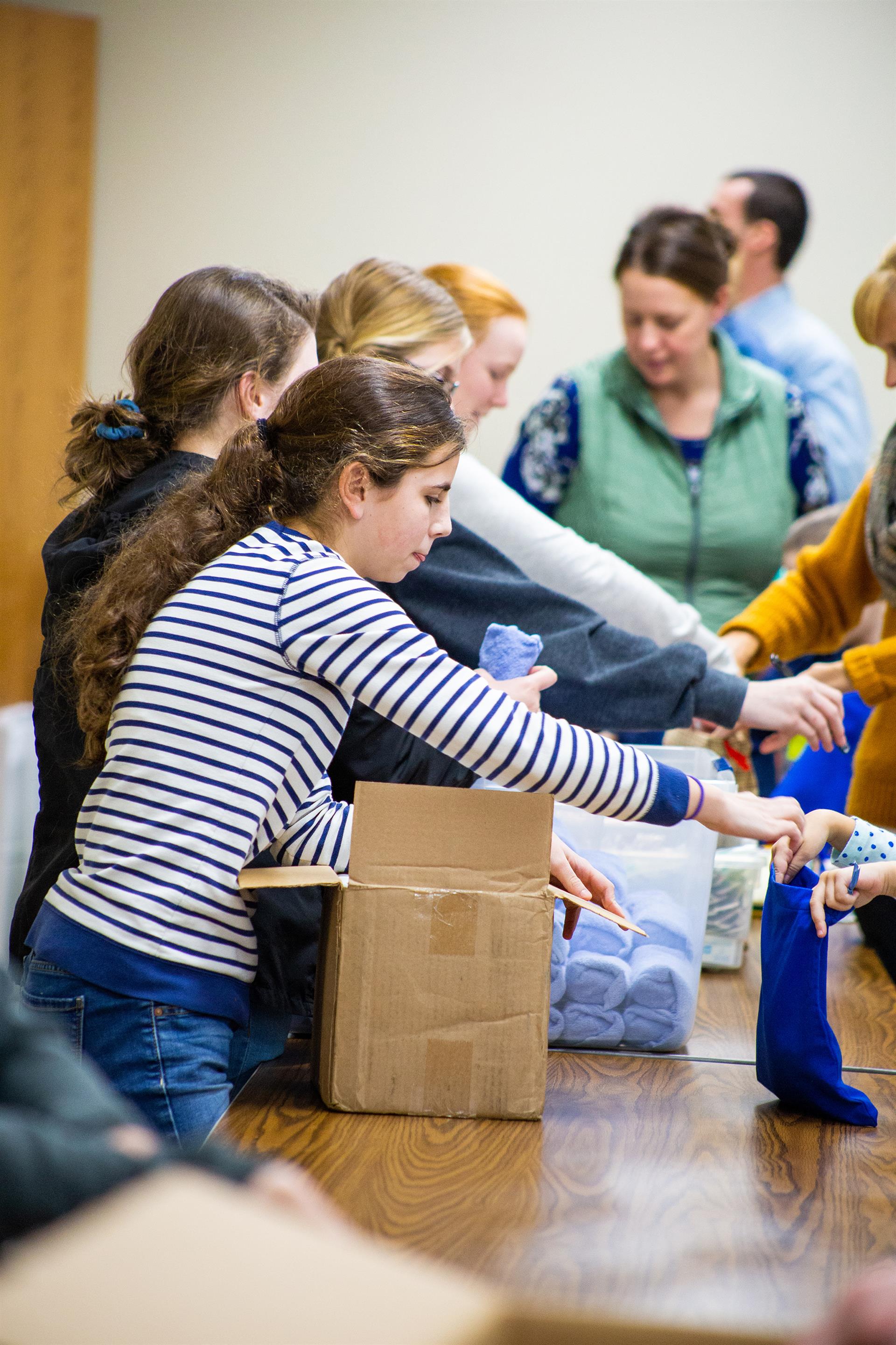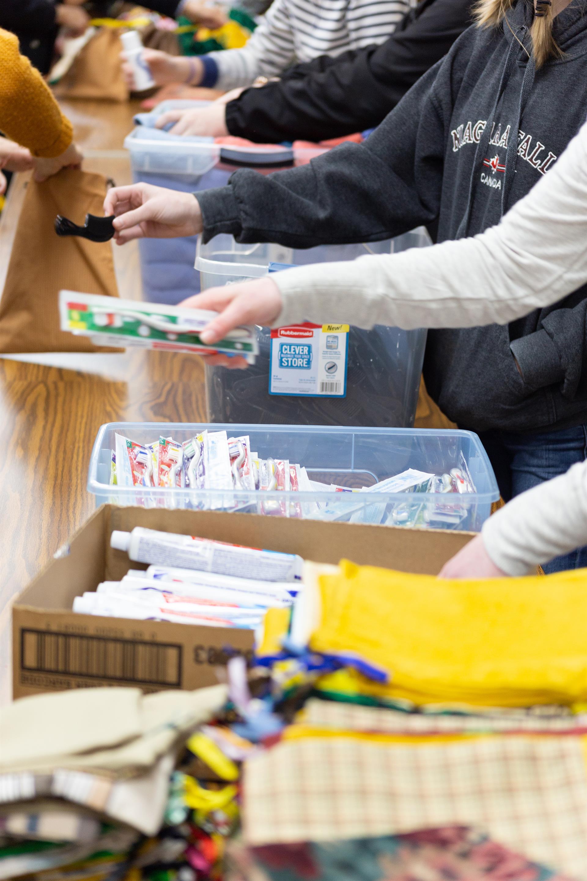7. If using drawstring bags, after filling the kit, tie the strings in a bow so the contents don’t spill out. If it is in a knot and needs to be cut, they can’t reuse the tie string bag