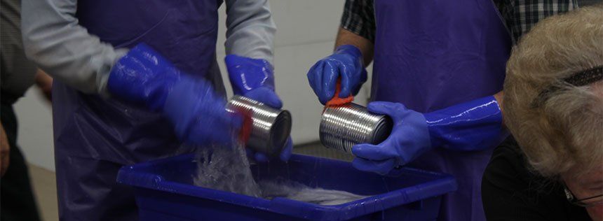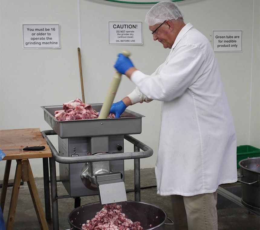 A trailer is rented from Mennonite Central Committee each fall and spring which includes the necessary equipment to seal the cans and process the meat in canners as well as several men trained to run the canners. Volunteers follow USDA approved procedures to grind the raw meat and fill cans to the appropriate weight. After the meat is processed in the canners, volunteers wash and label the cans.
