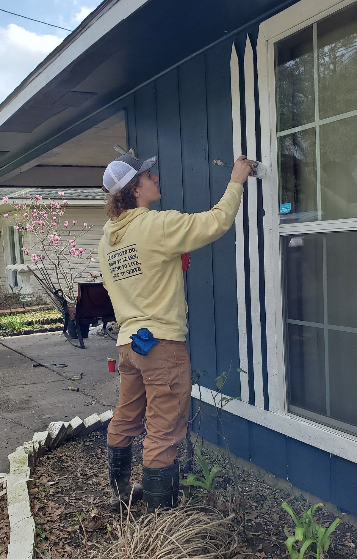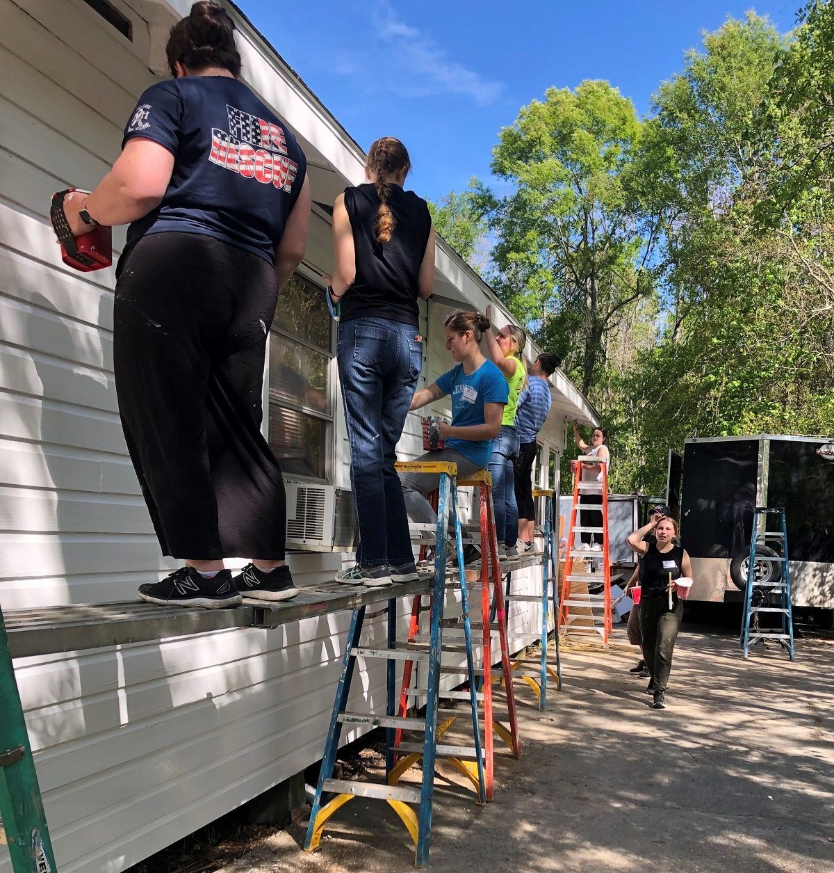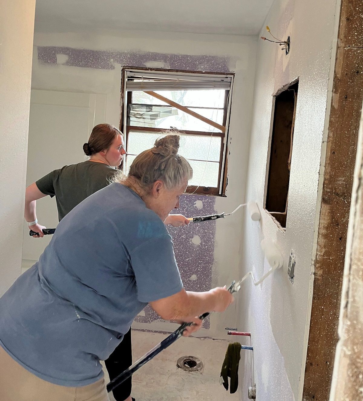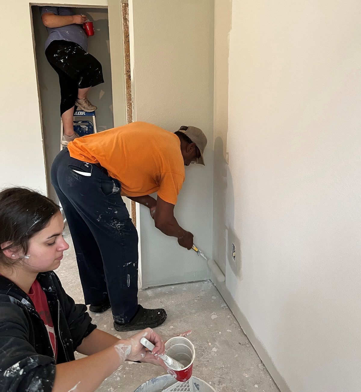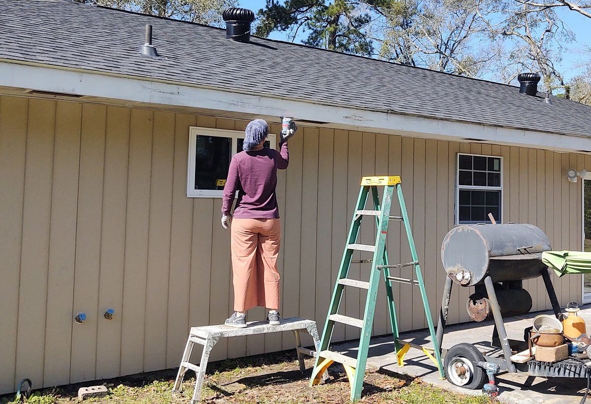 Painting a message on the outside of Keosha’s home before painting the exterior