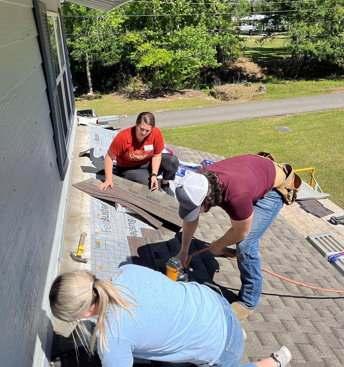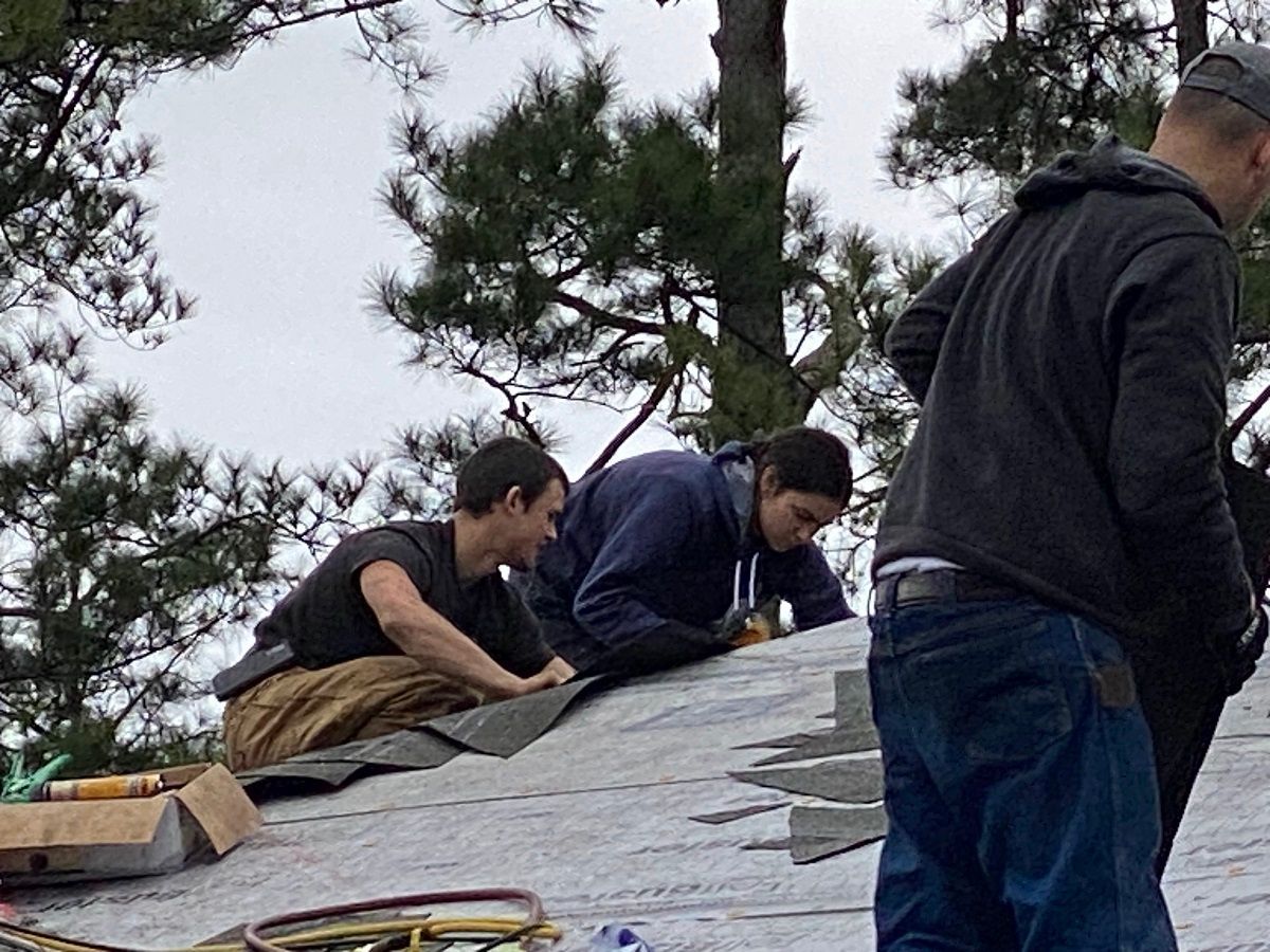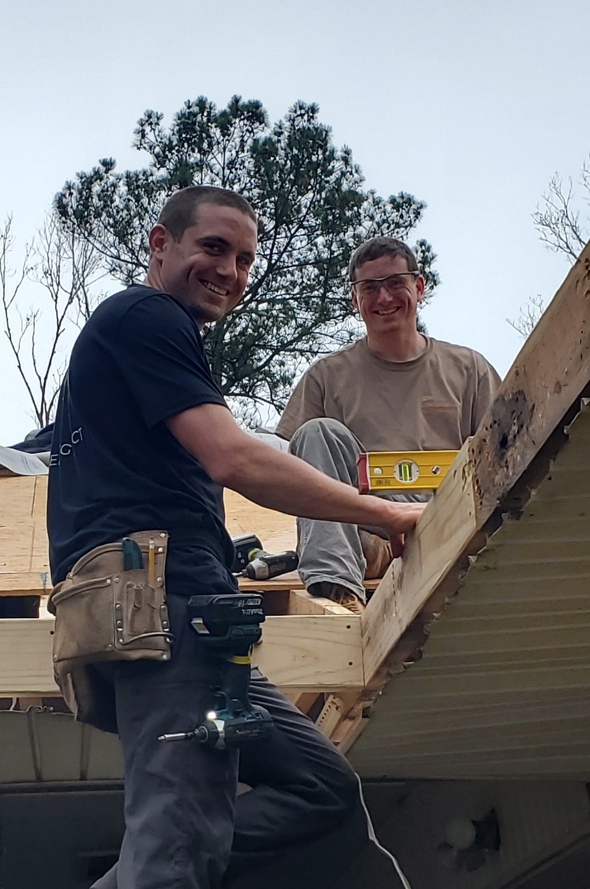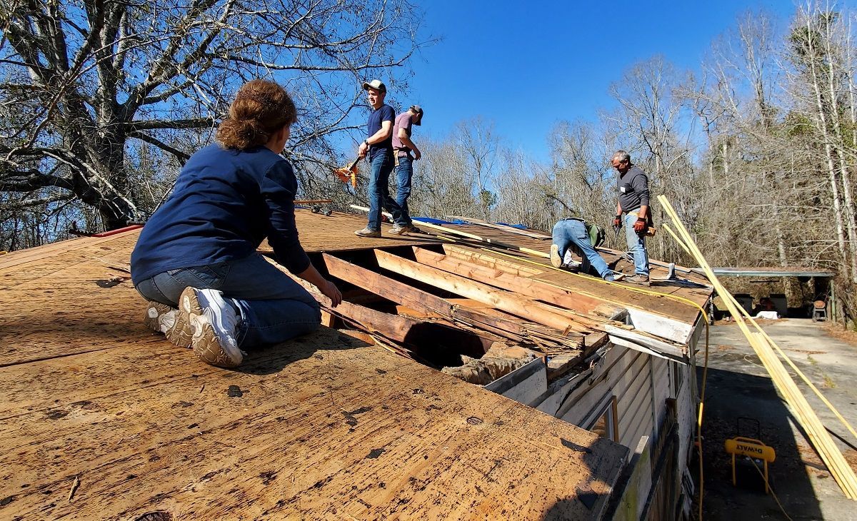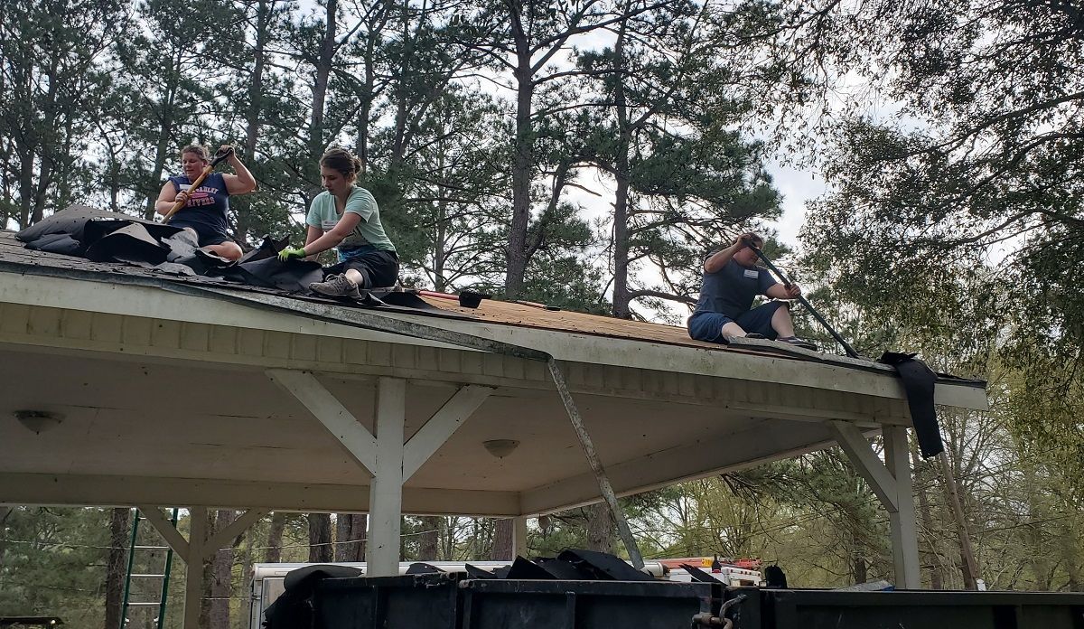 Repairing holes in Vanessa’s roof caused by a tree falling on it