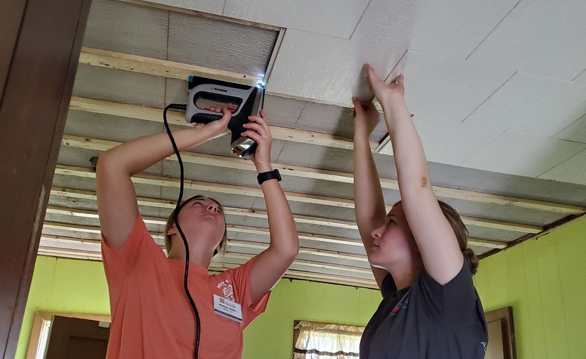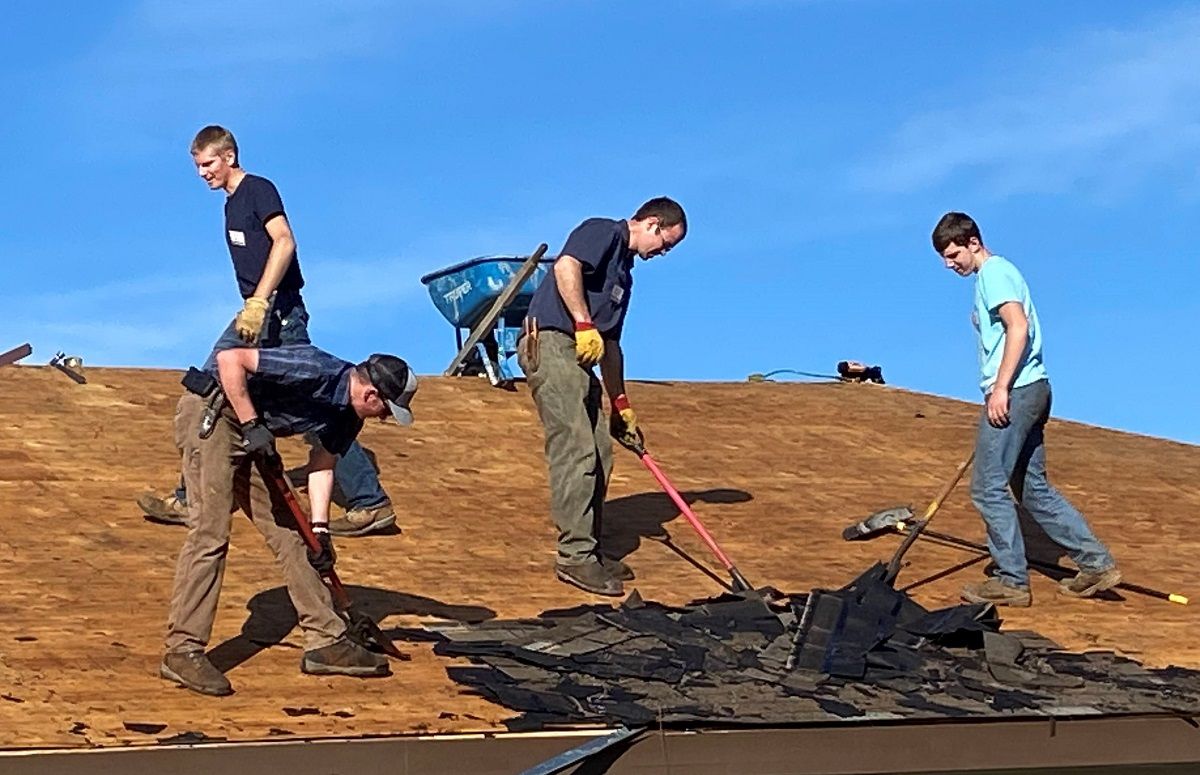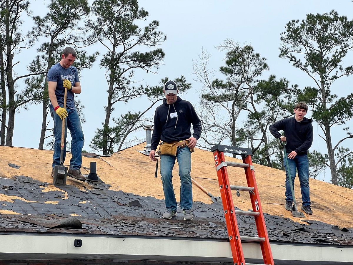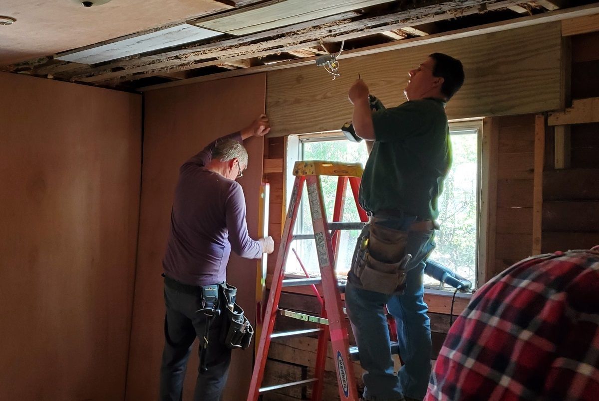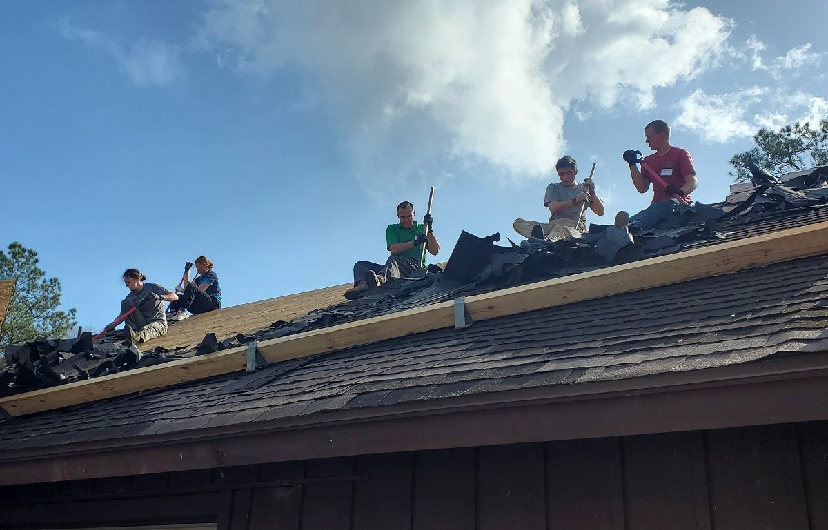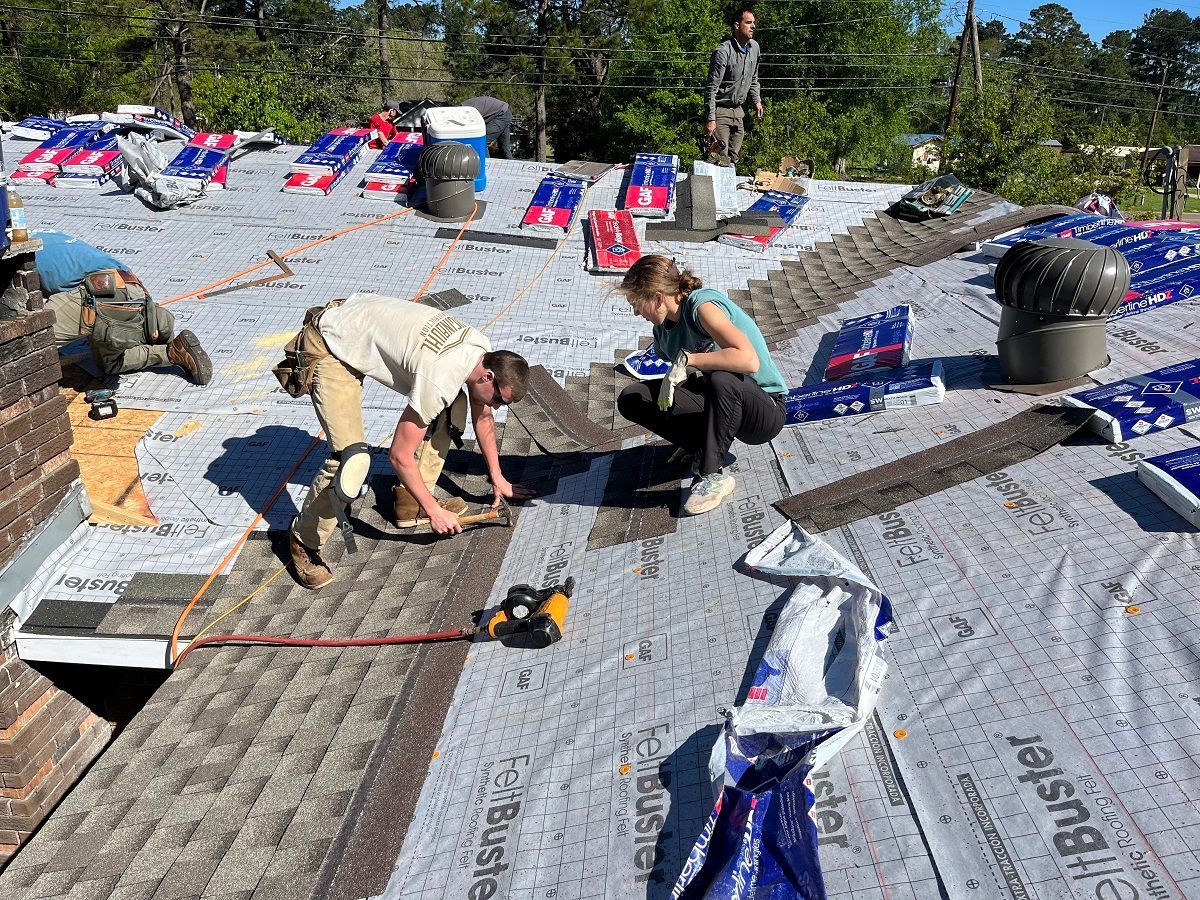 Repairing holes in Vanessa’s roof caused by a tree falling on it