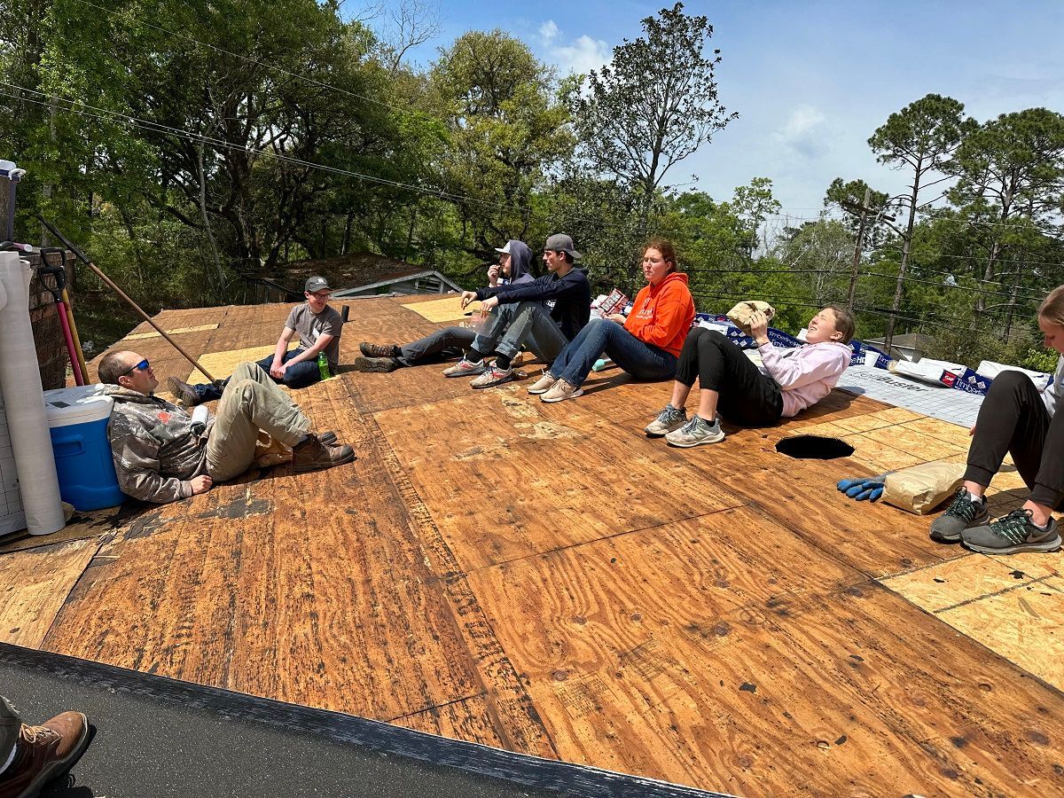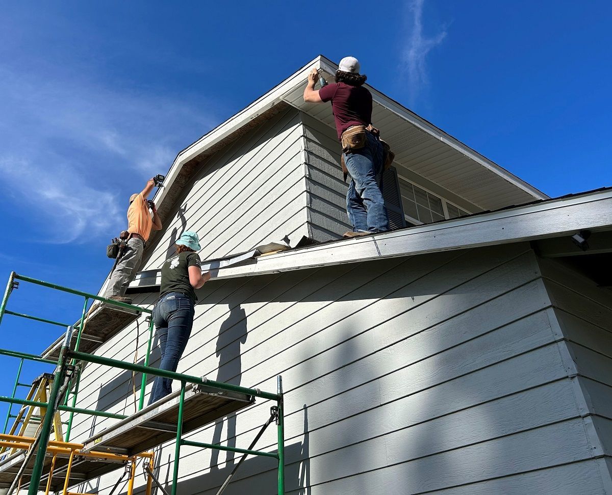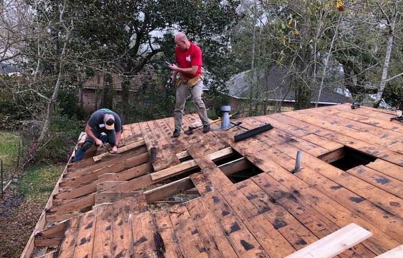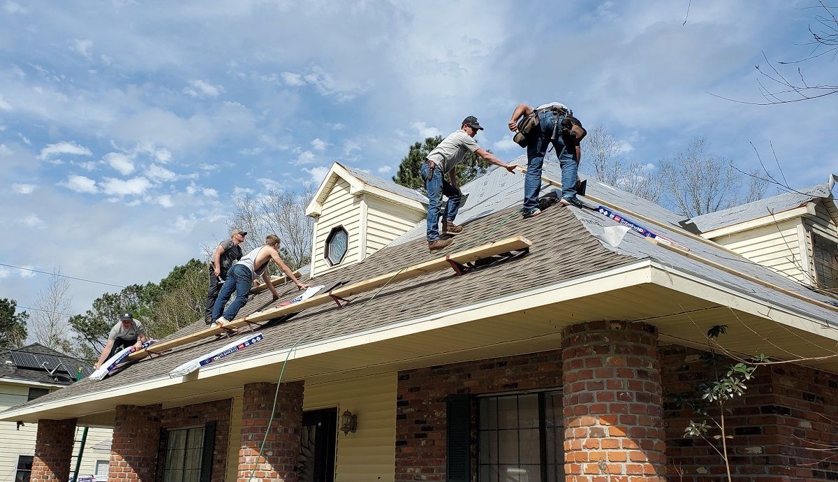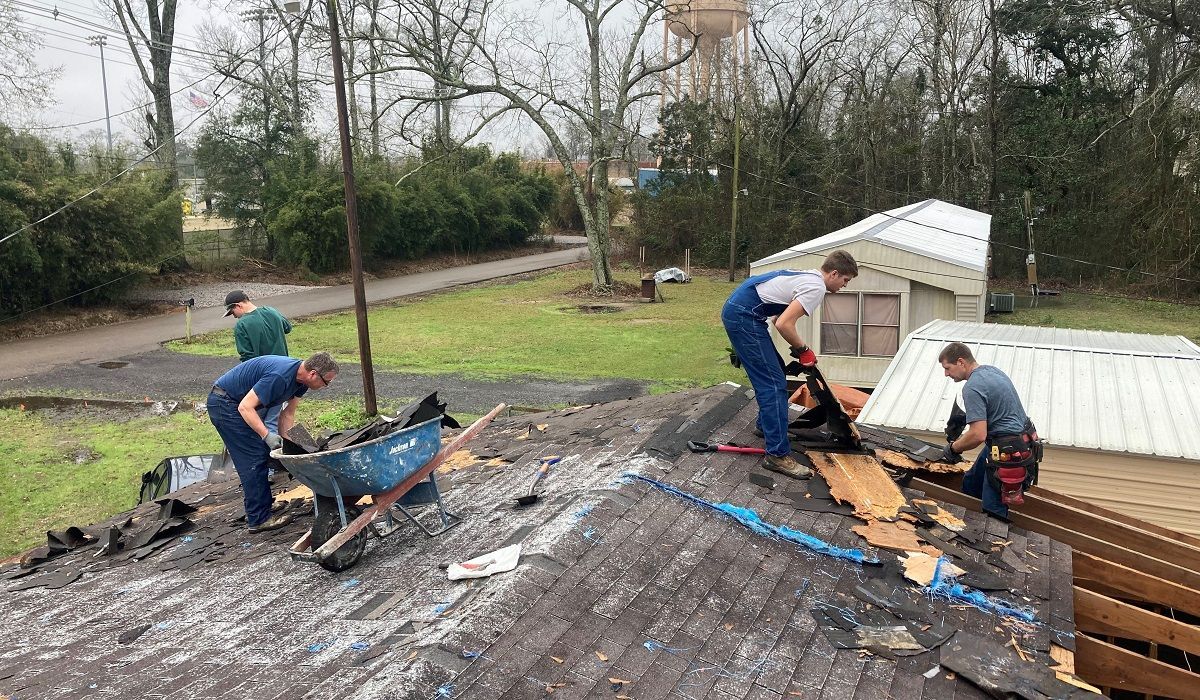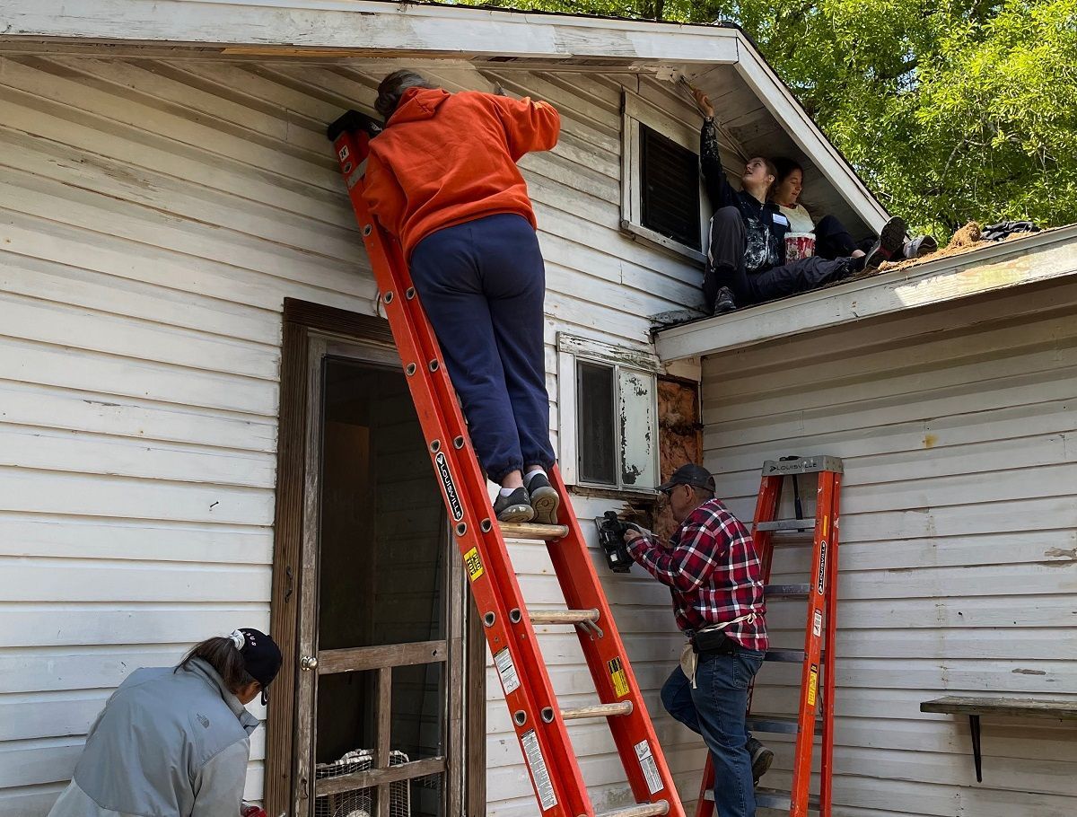 Repairing holes in Vanessa’s roof caused by a tree falling on it