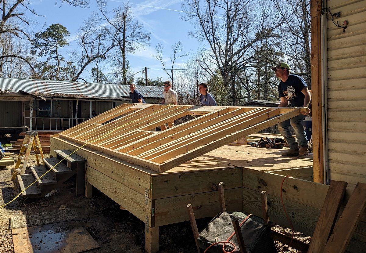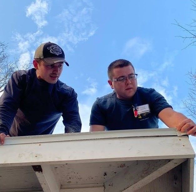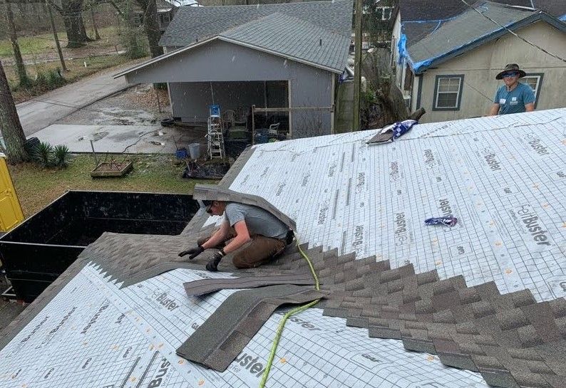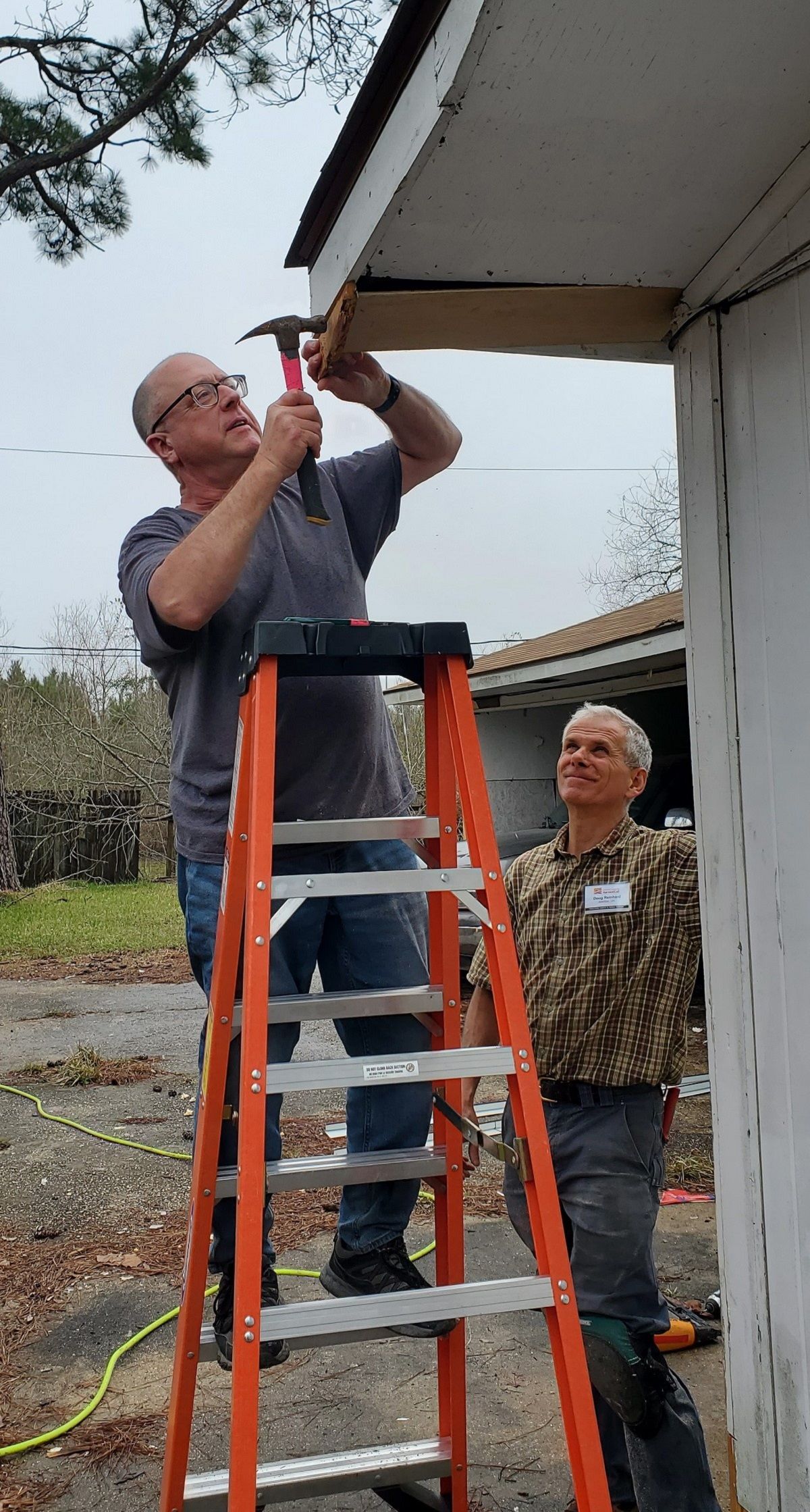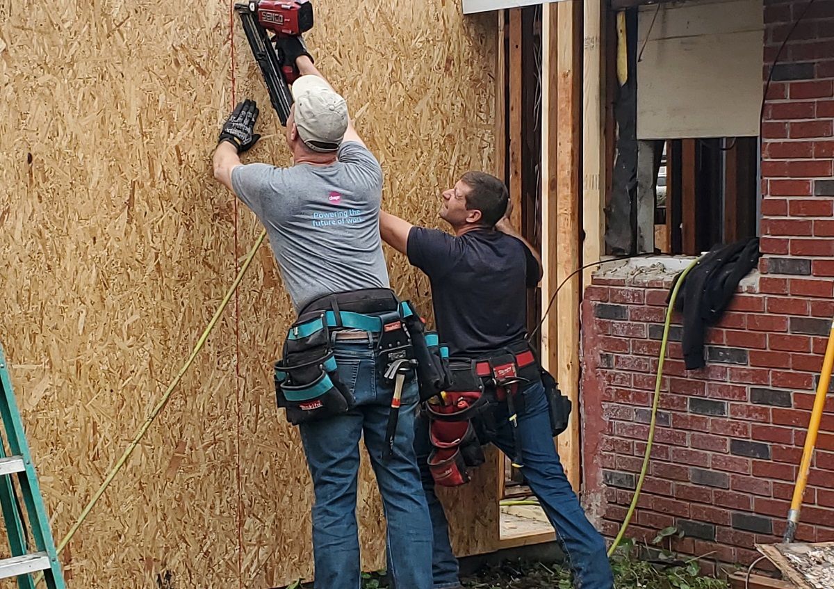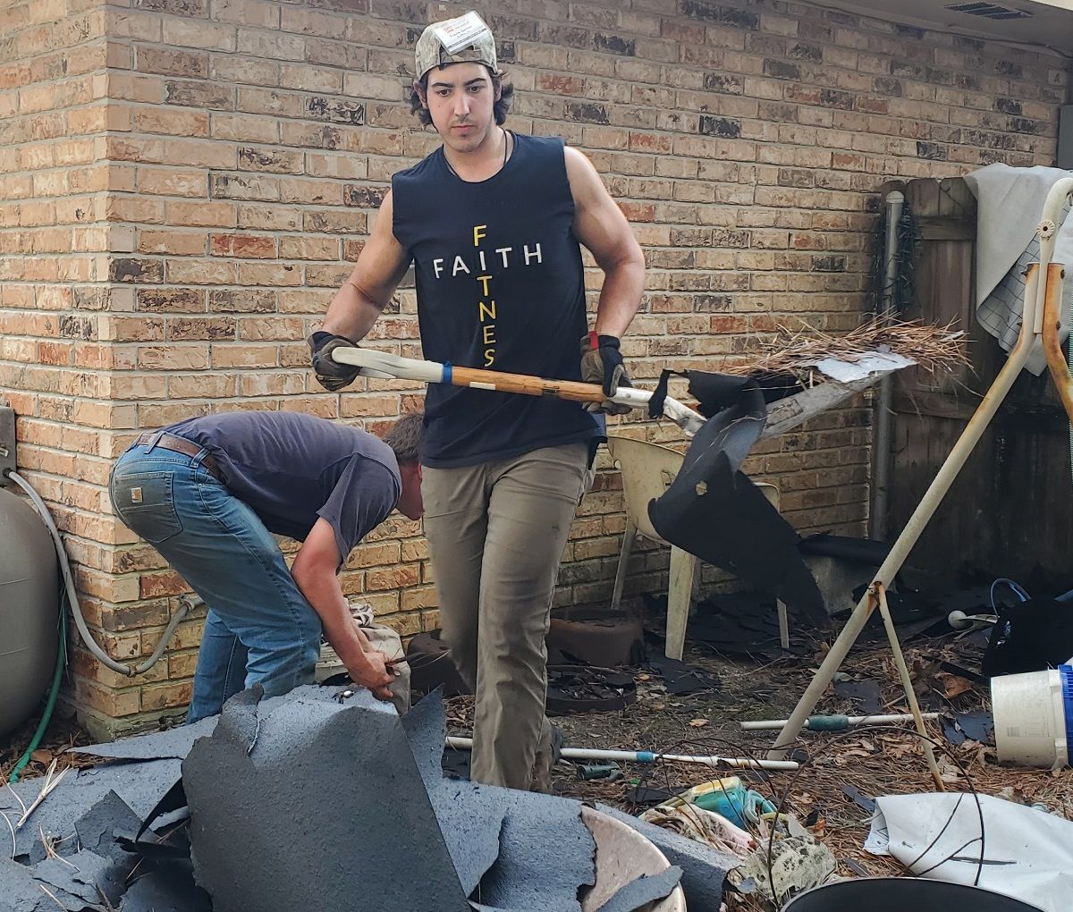 Repairing holes in Vanessa’s roof caused by a tree falling on it