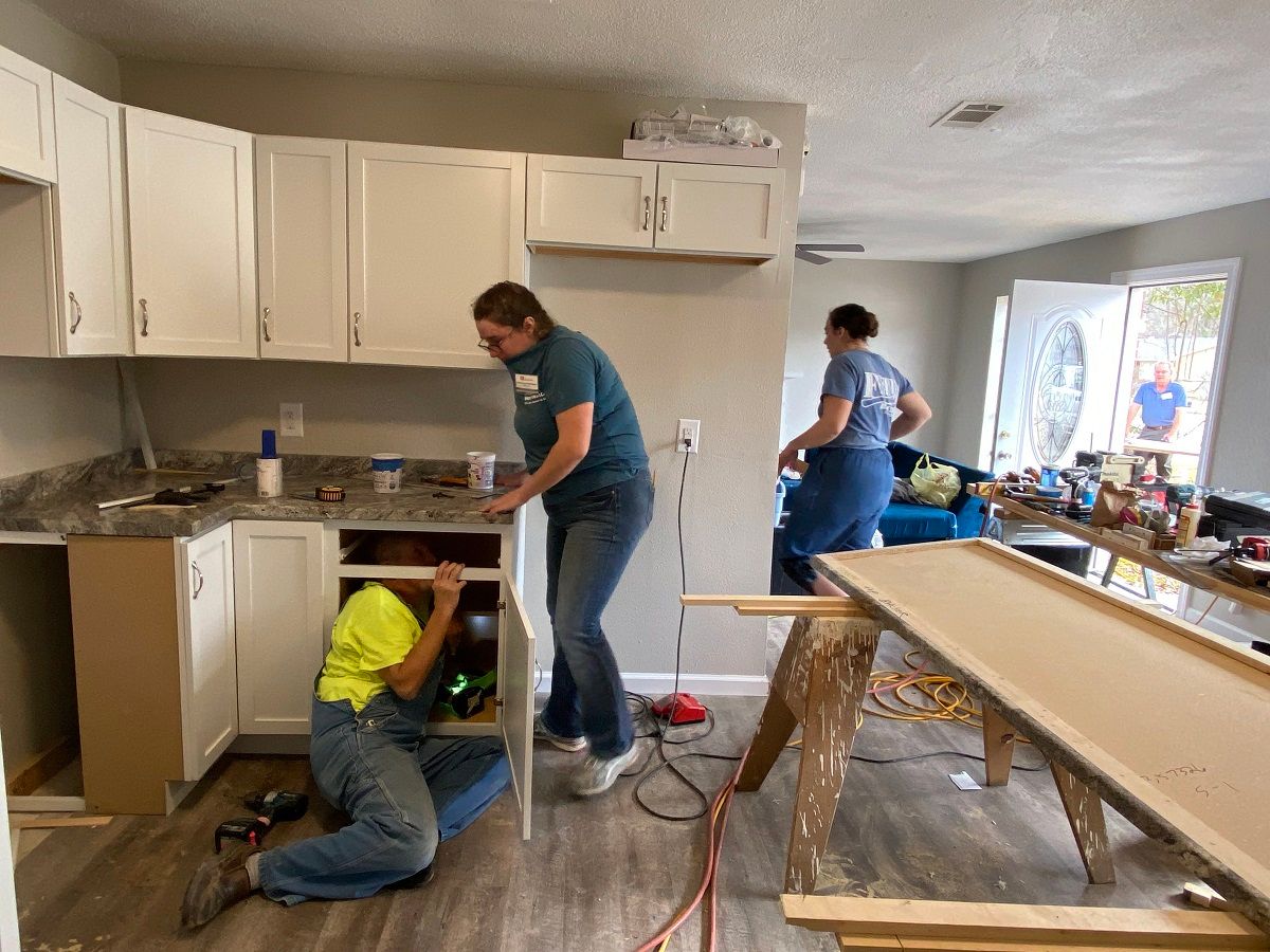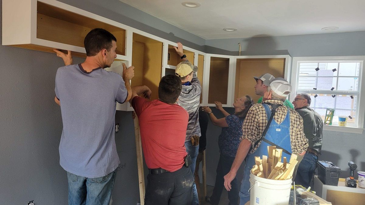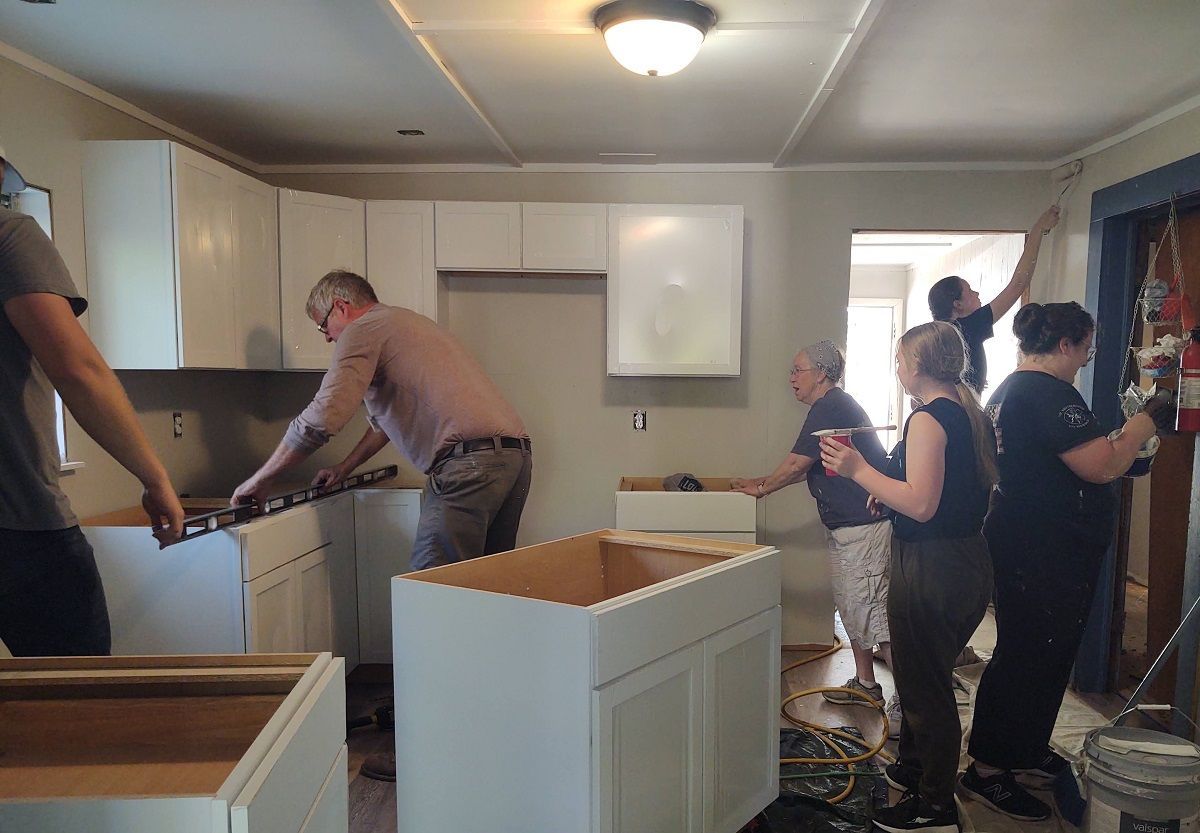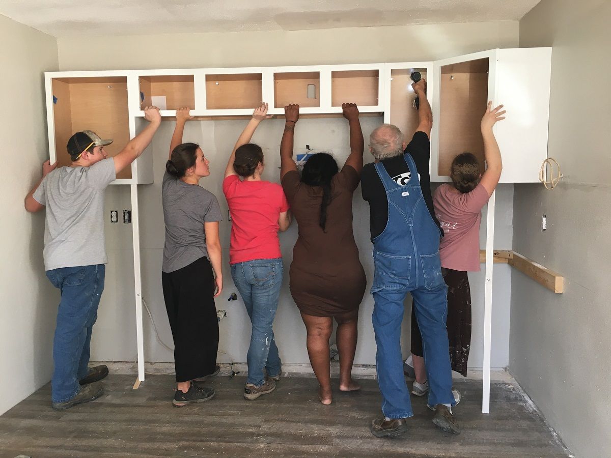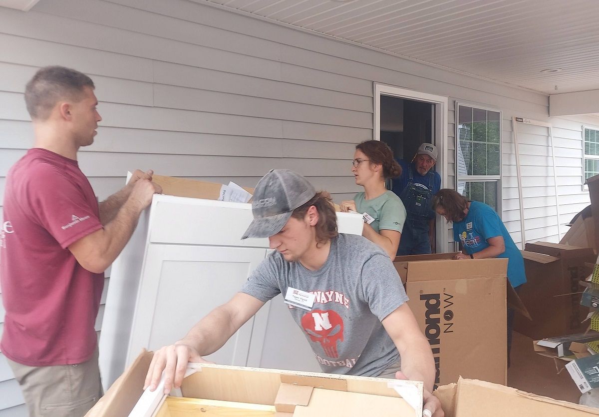 Volunteers unloading and unboxing kitchen cabinets at Erma’s new house