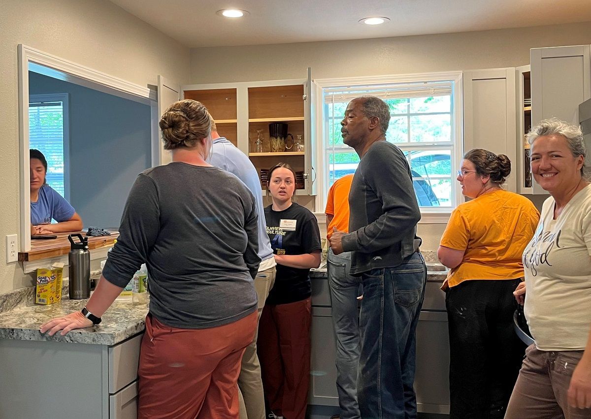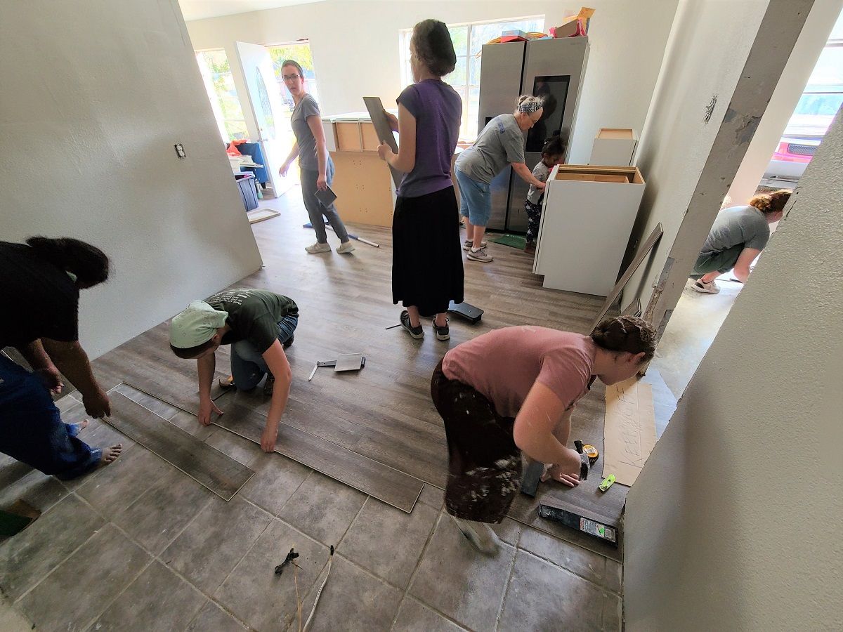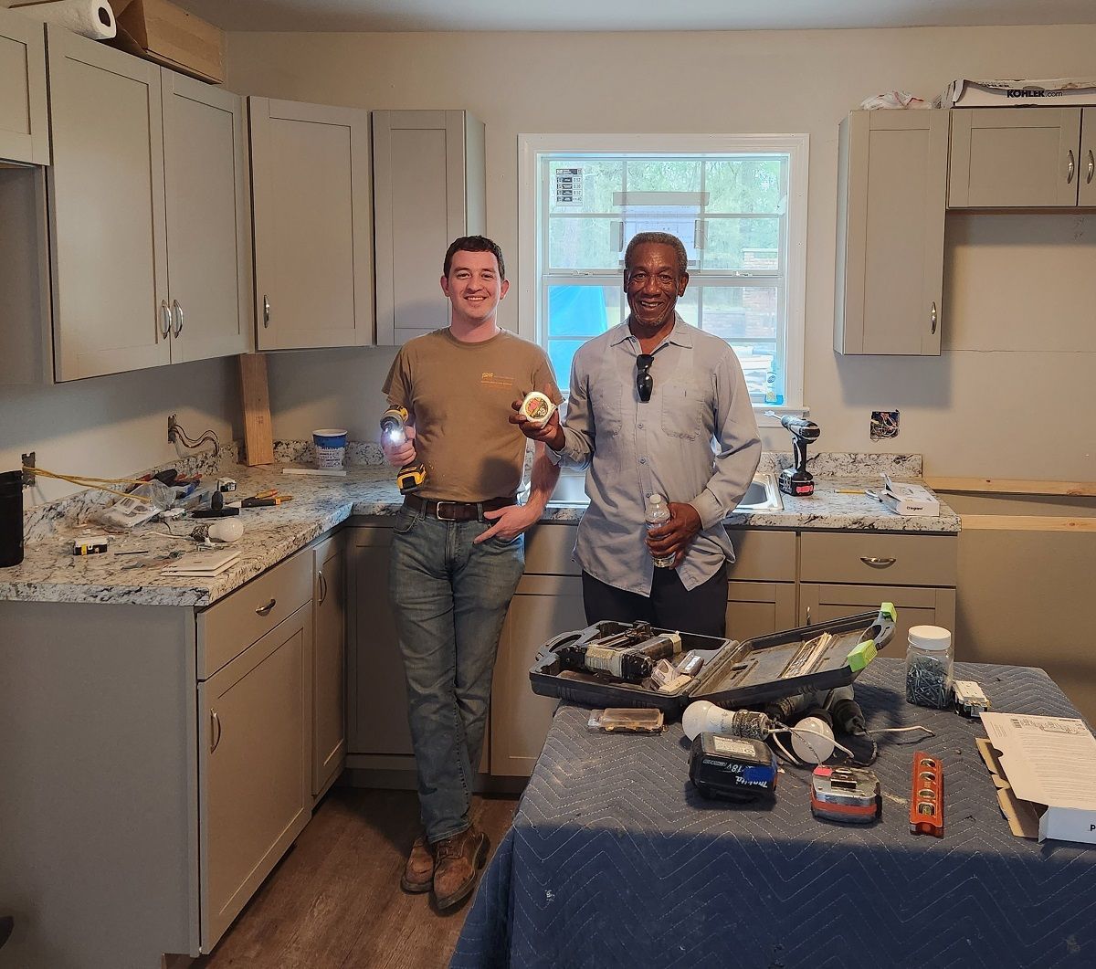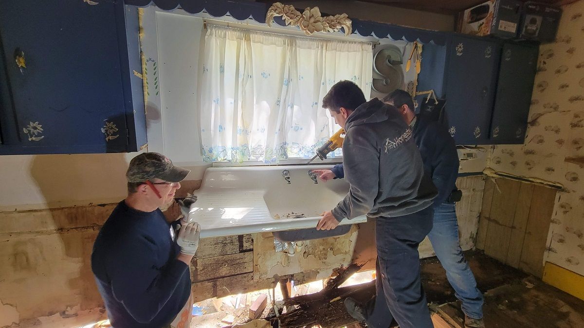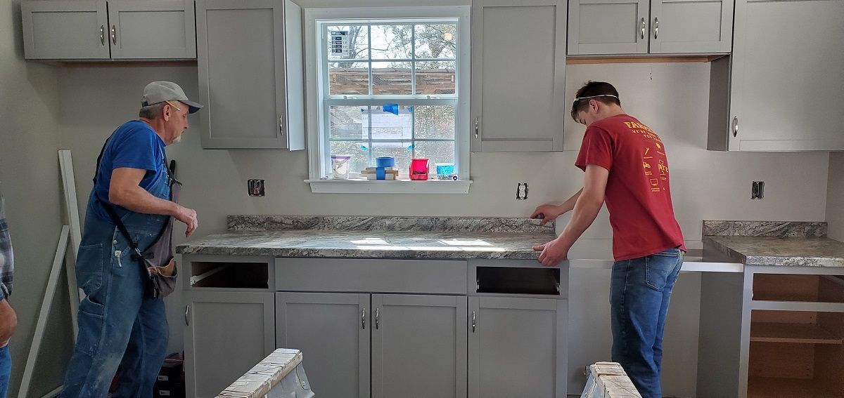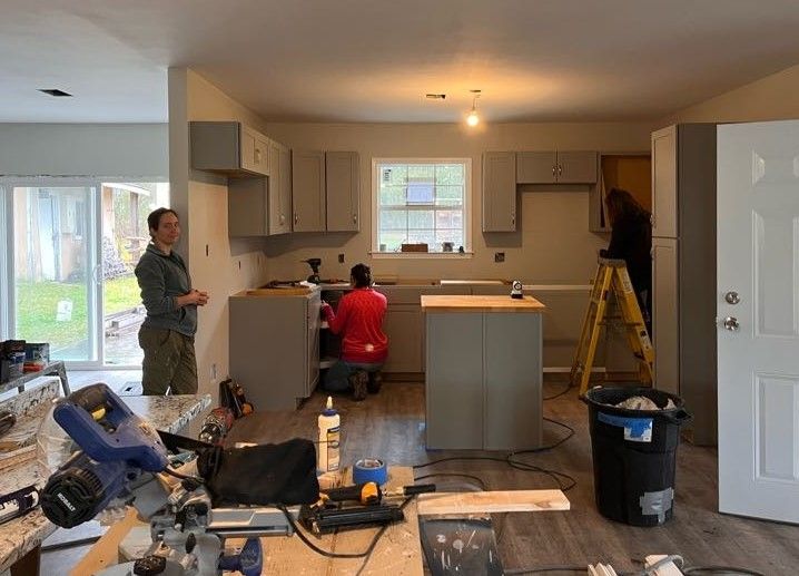 Volunteers unloading and unboxing kitchen cabinets at Erma’s new house