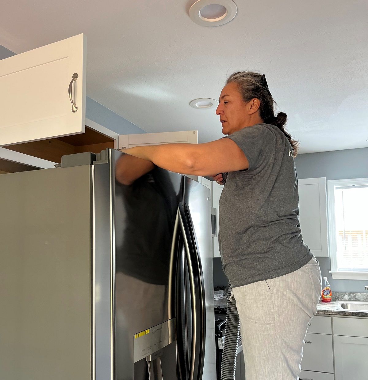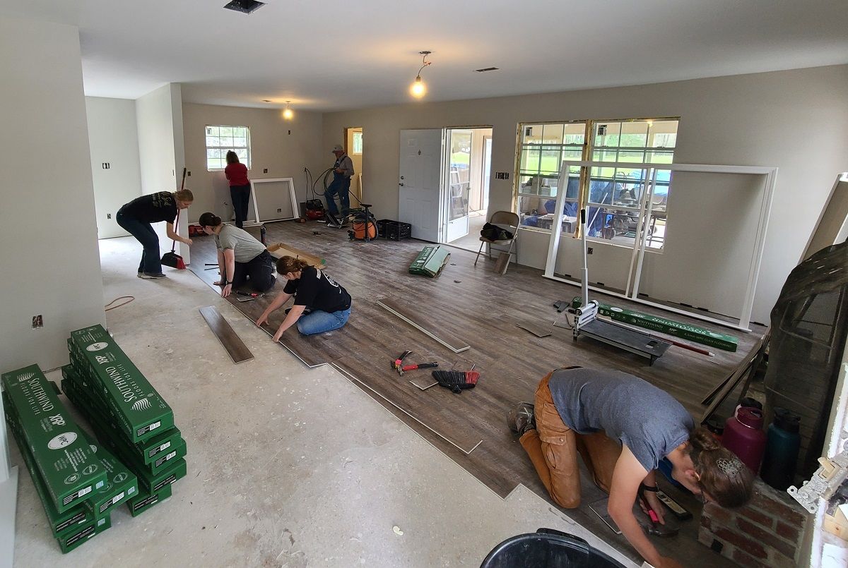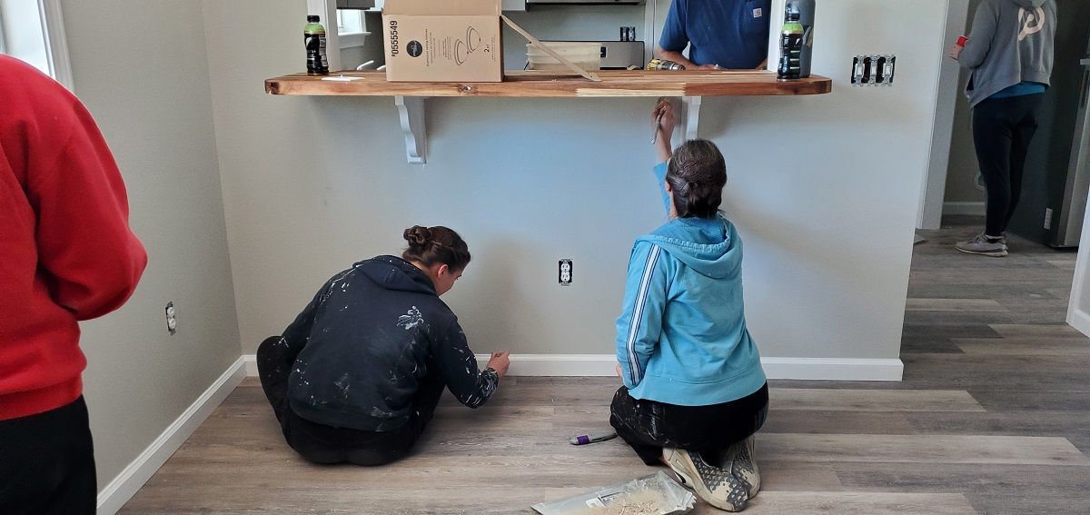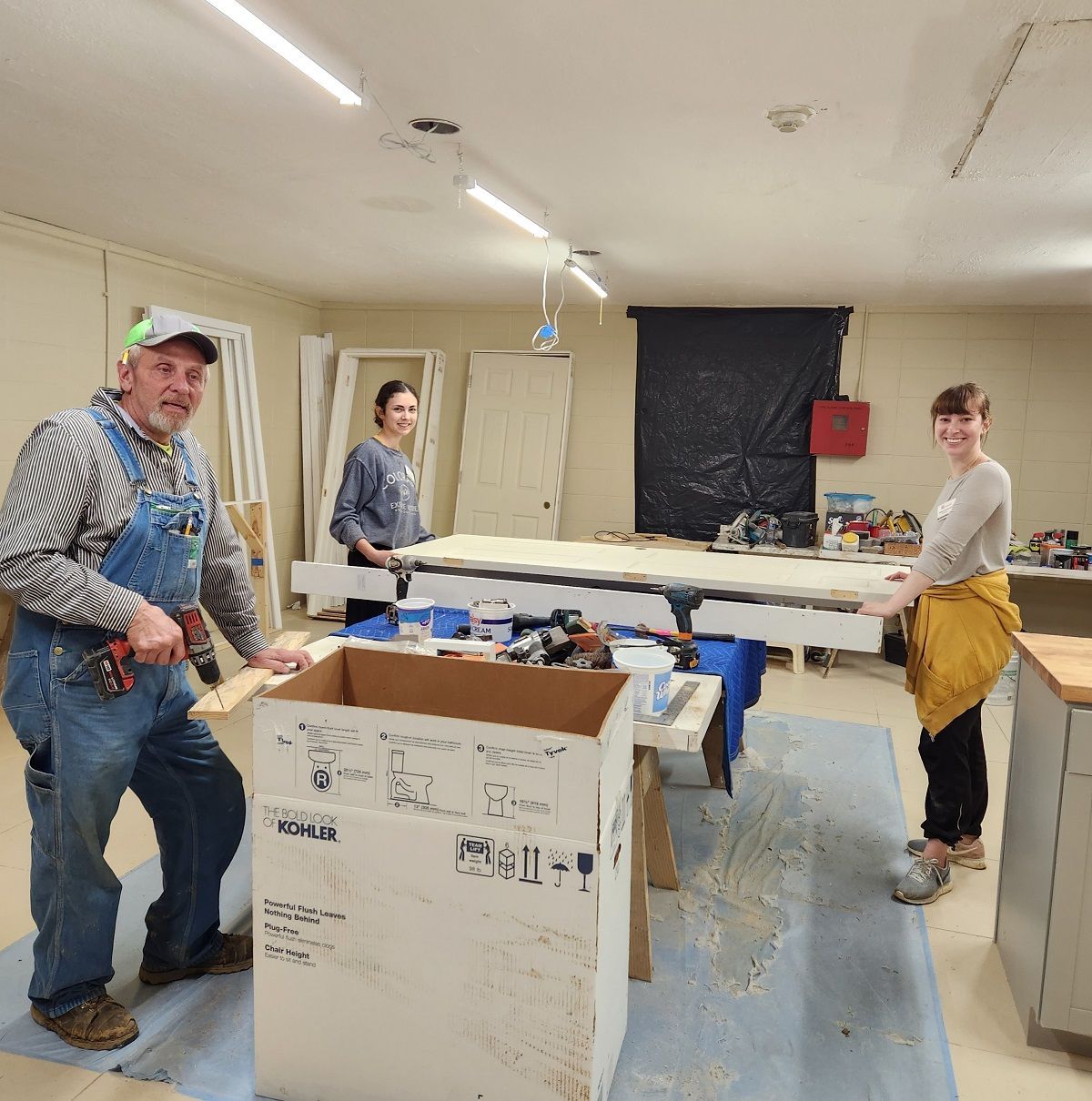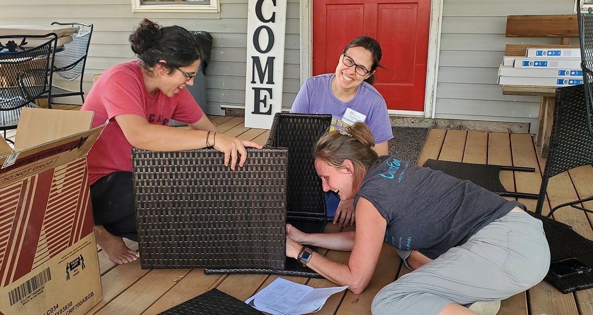 Volunteers unloading and unboxing kitchen cabinets at Erma’s new house