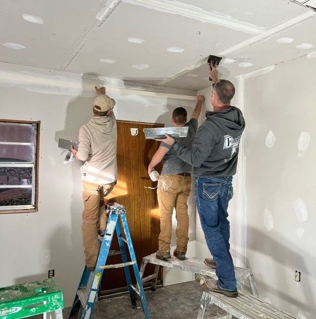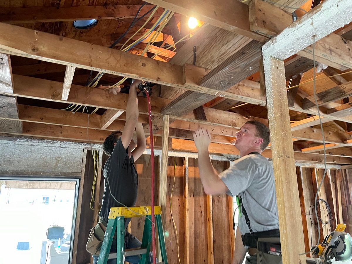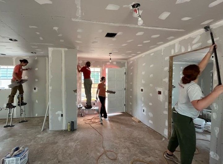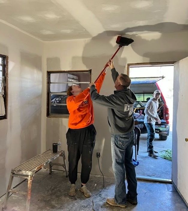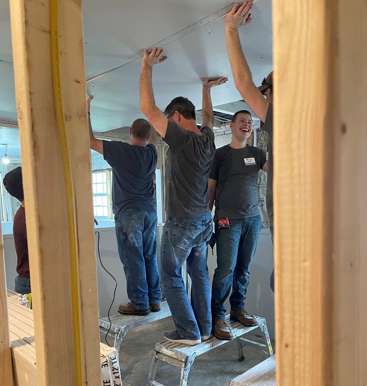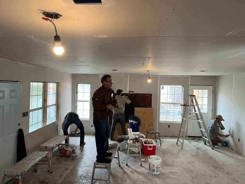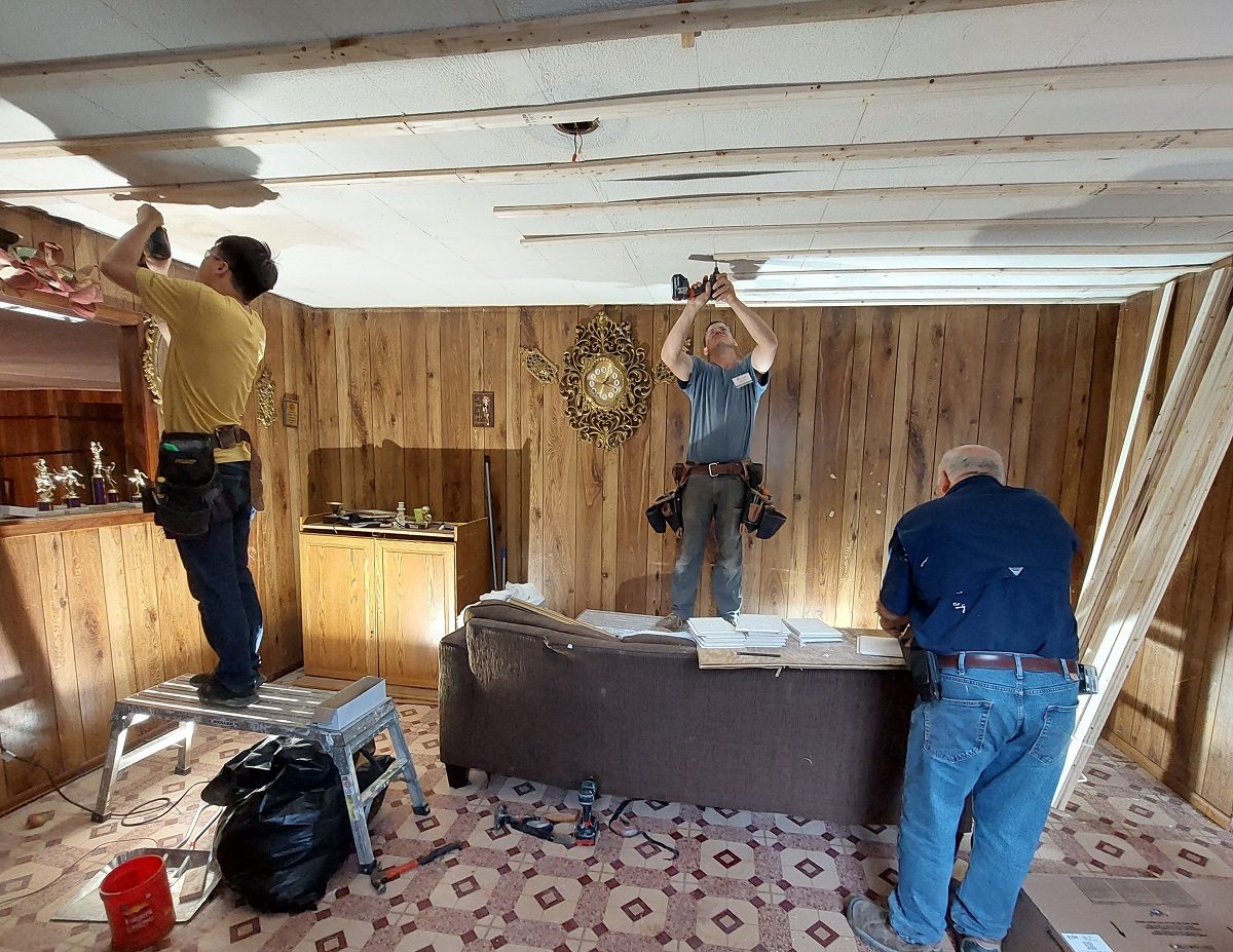 Hanging drywall on the ceiling at Darrel’s remodeled house