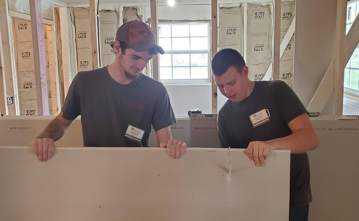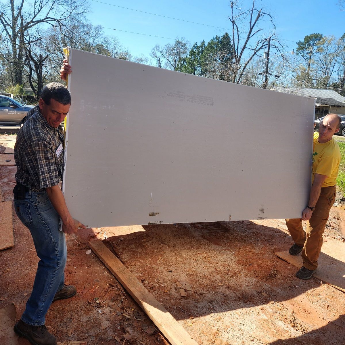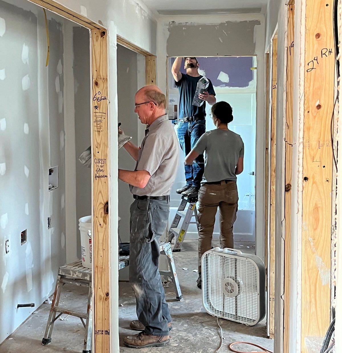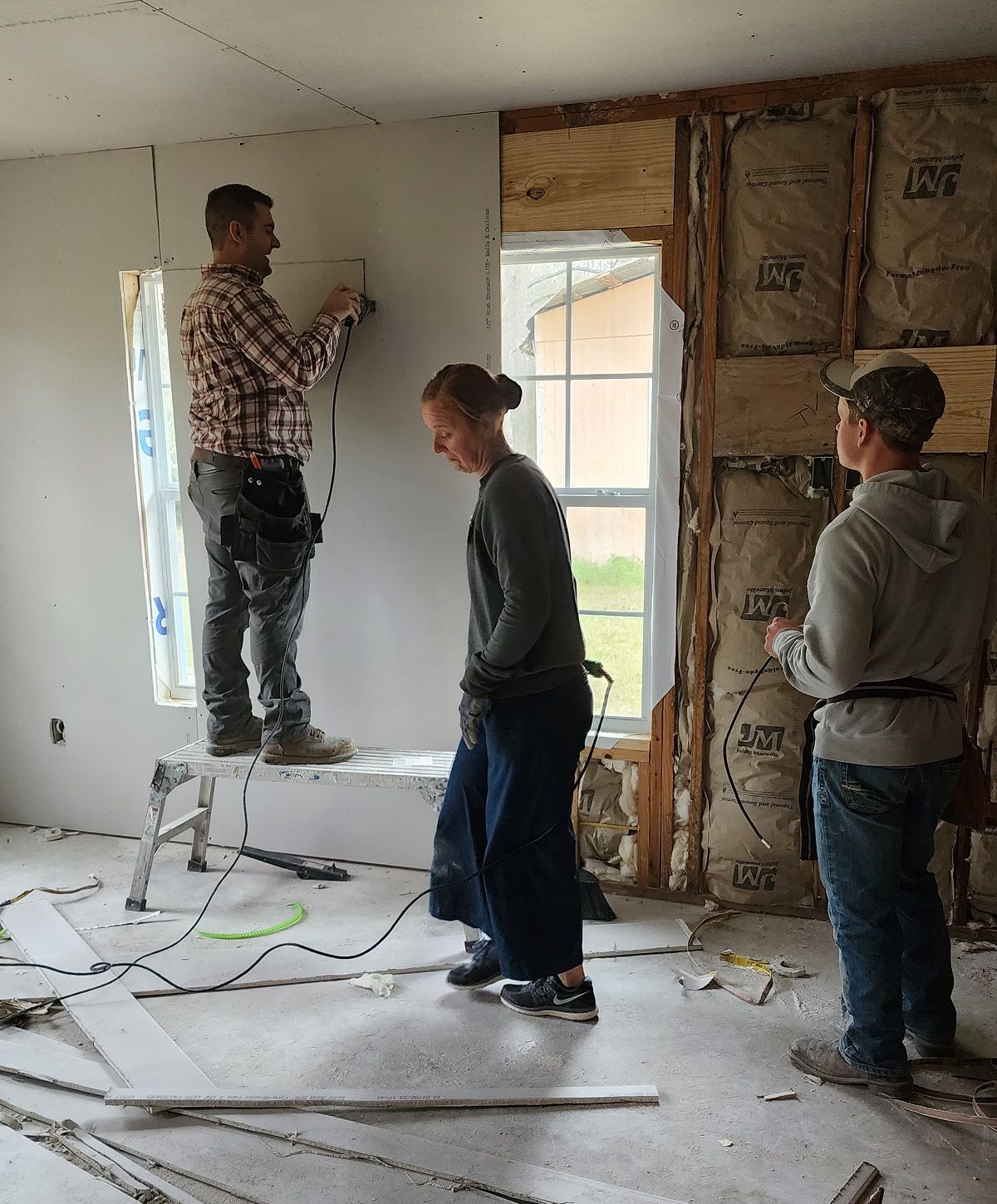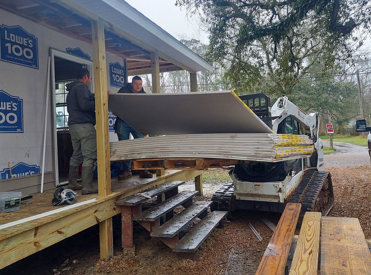 Carrying sheets of drywall into Sullivan’s remodeled home