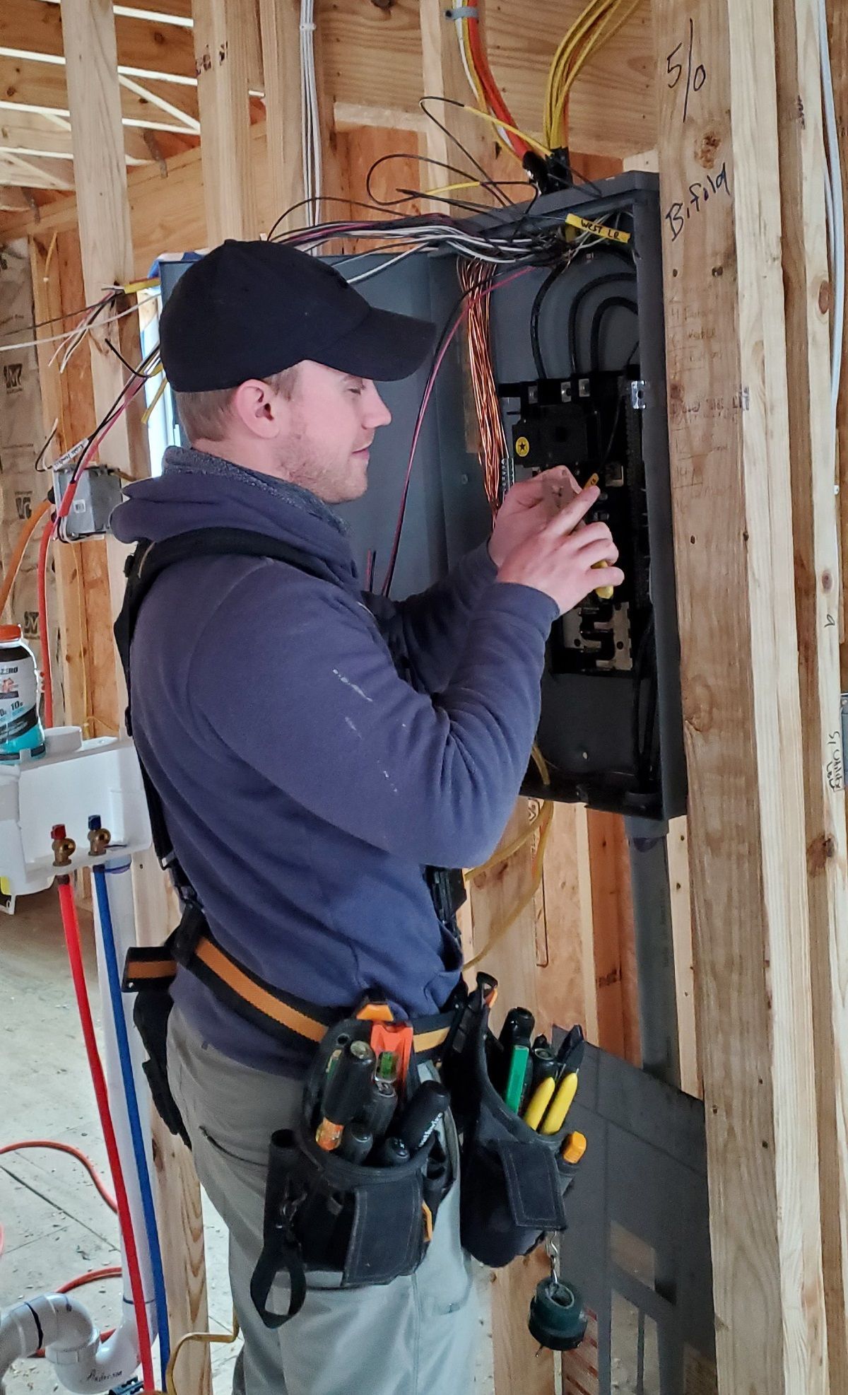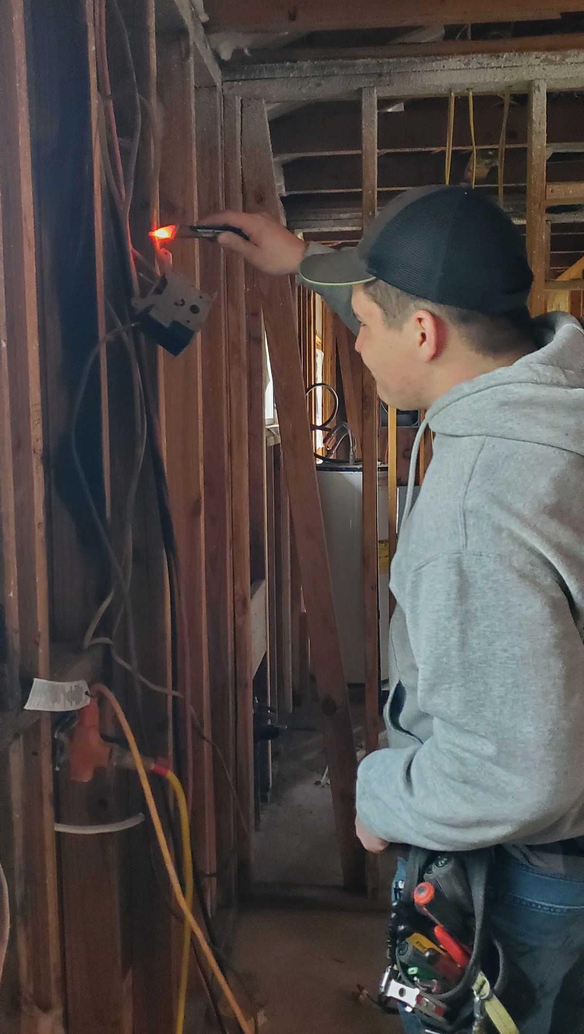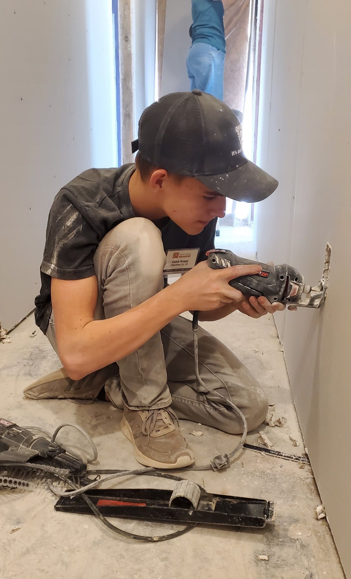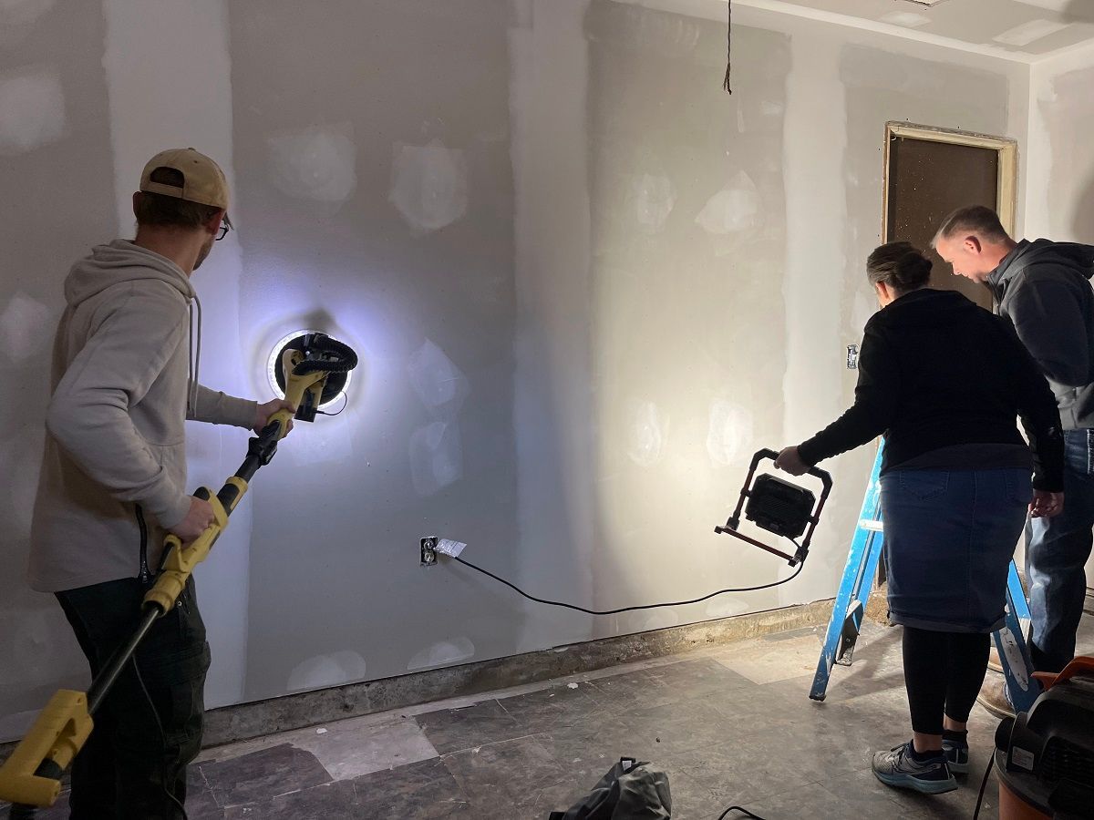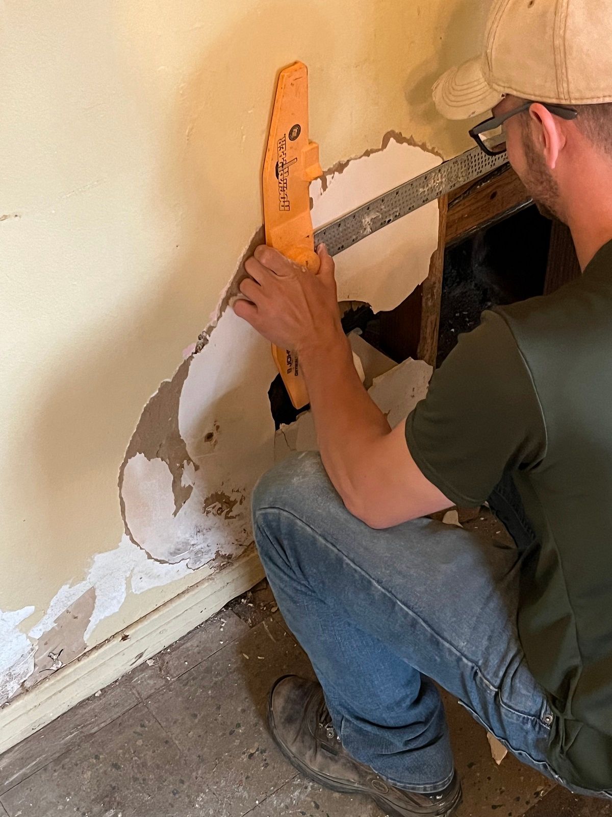 Roto-zipping outlet holes in drywall at Darrel’s house