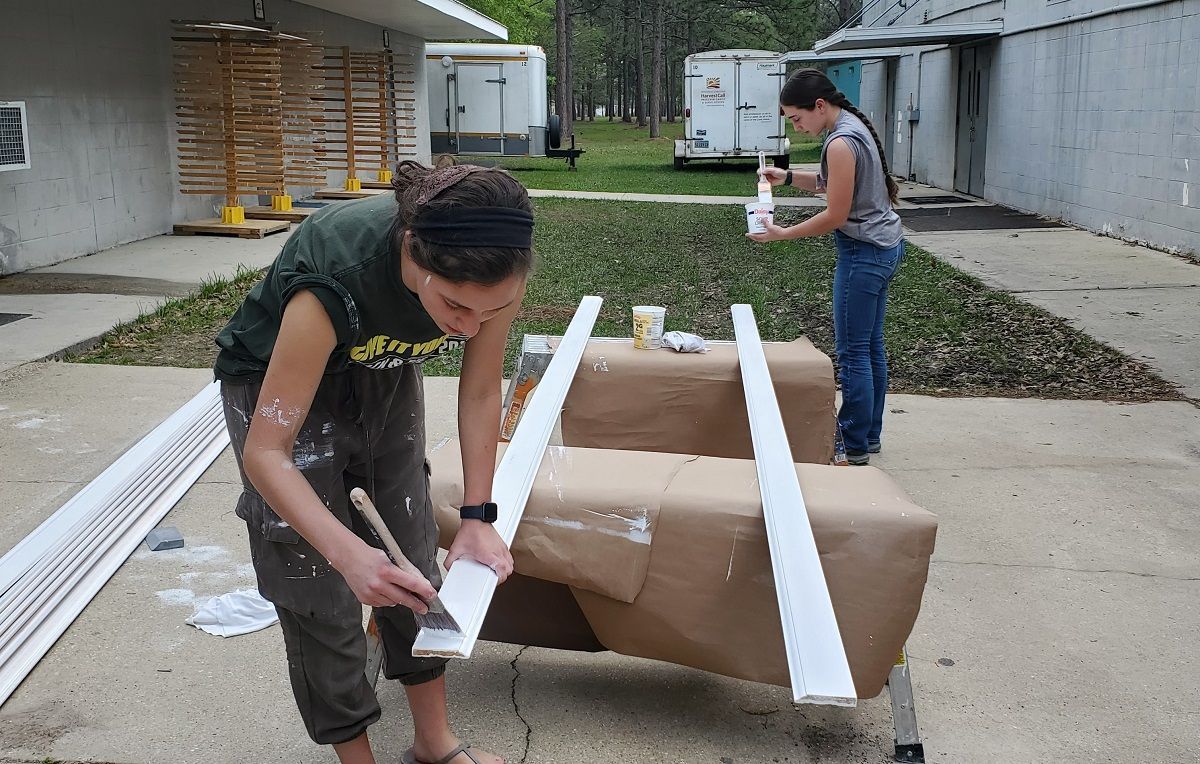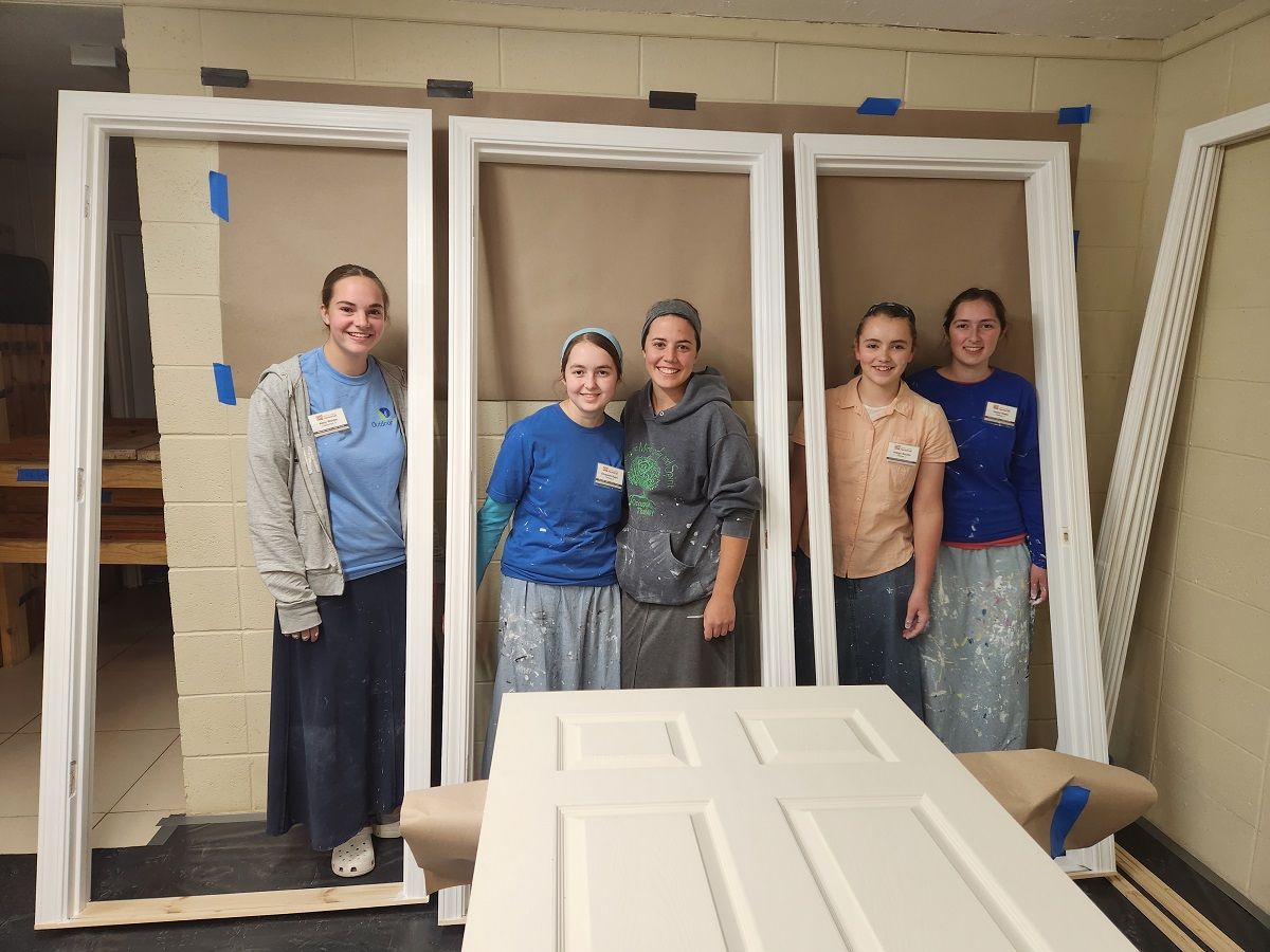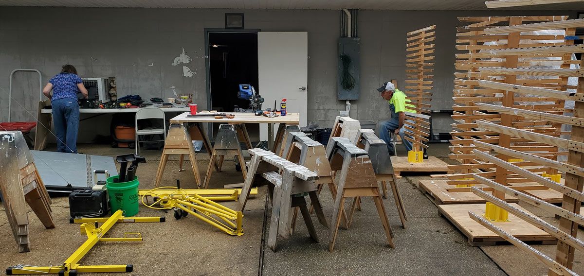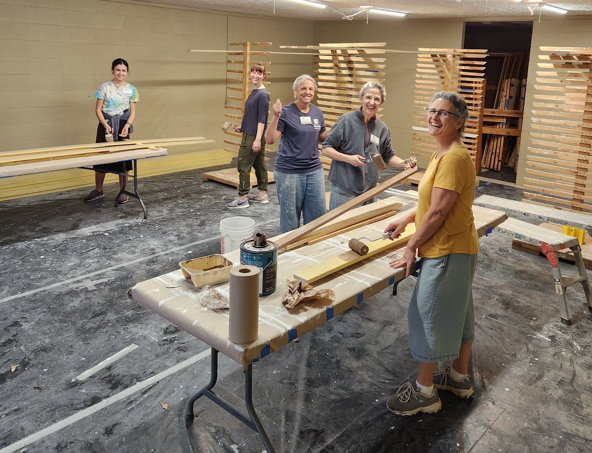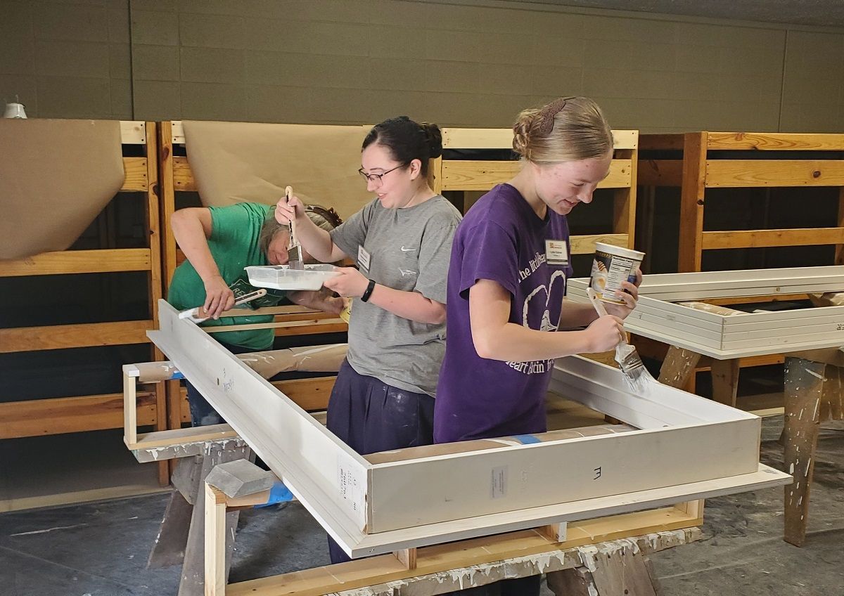 Disassembling bunk beds and storing them in the bathroom for the Paint and Trim Shop