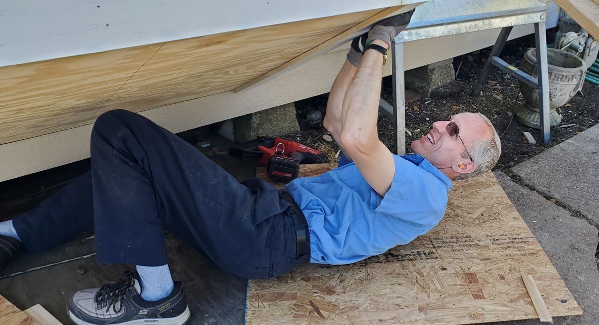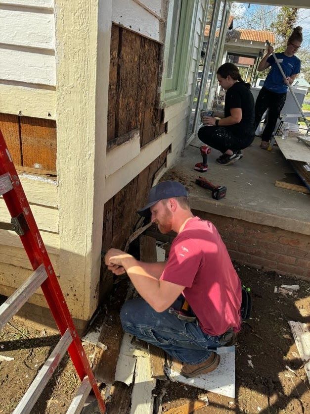 Volunteer working on framing a bay window on Mr. Carlton and Miss Mary’s house