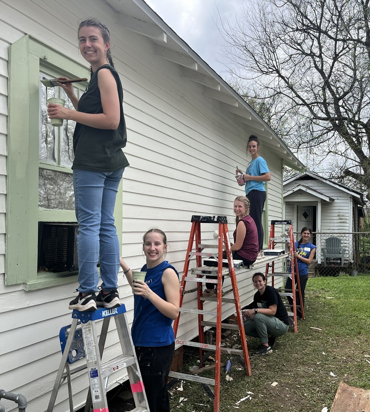 Large group at miss Mable’s house, painting the exterior