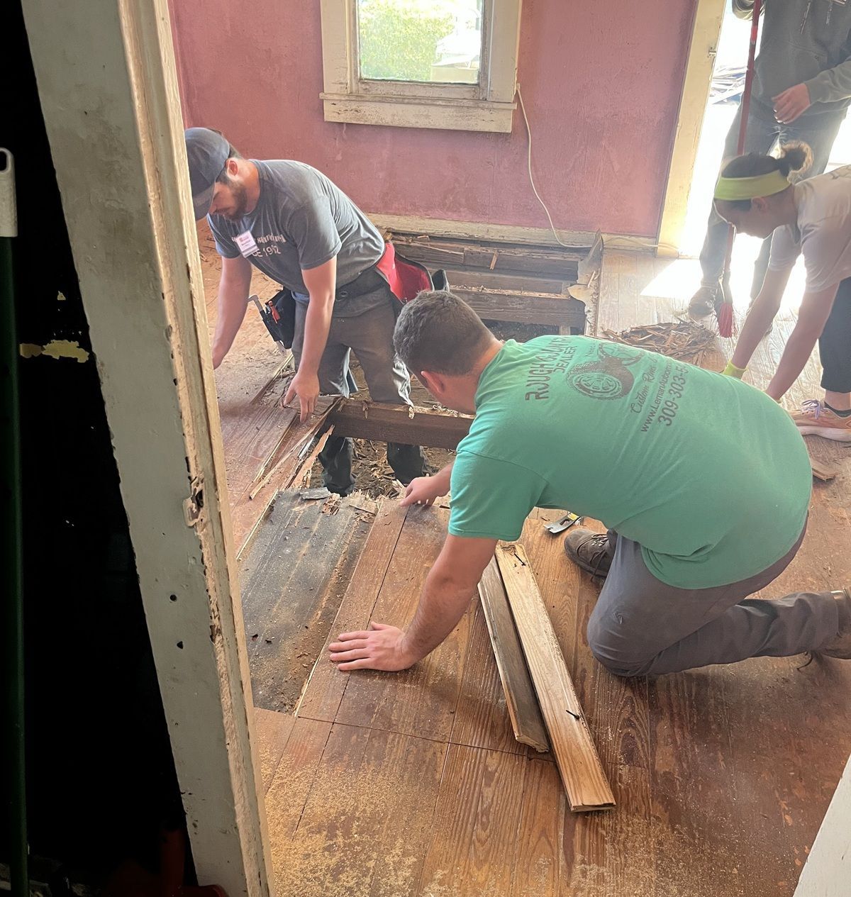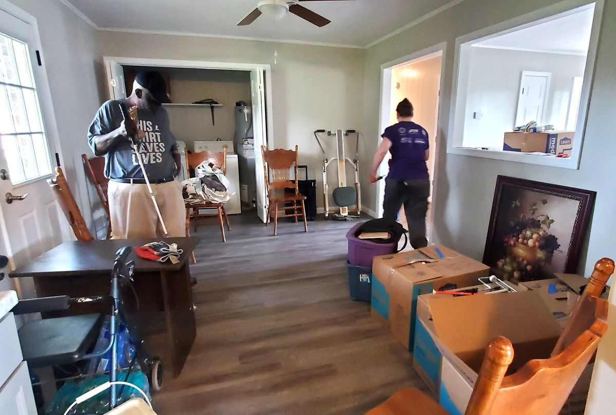 Picking up a pile of debris from wall and floor removal at Miss Cora’s house