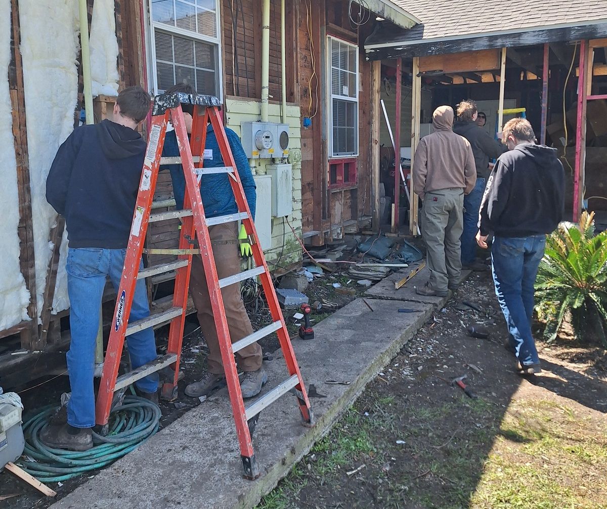 Mr. Carlton observing volunteers removing damaged siding on his house