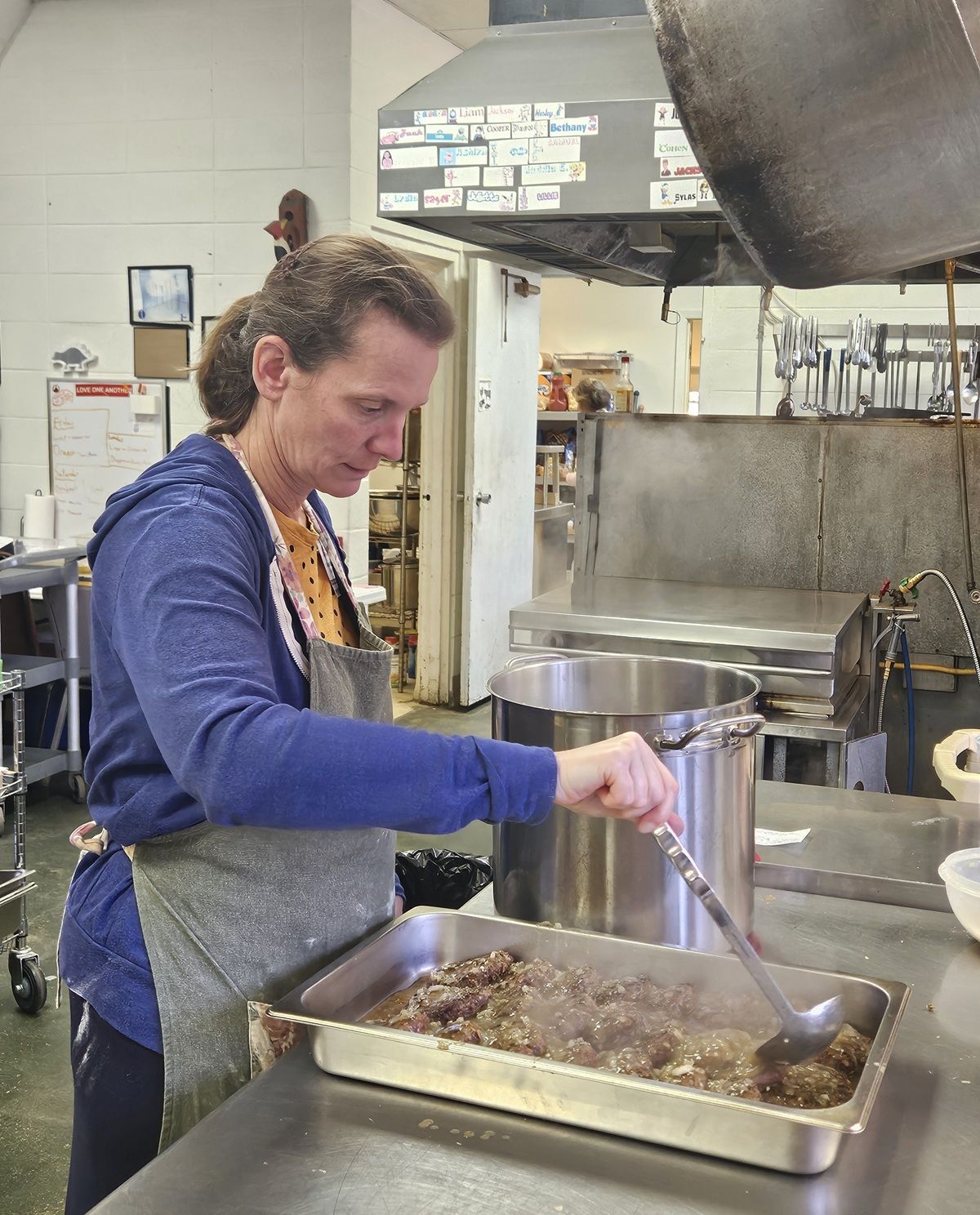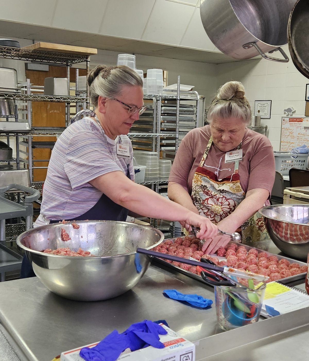 Kitchen volunteers making meat balls for supper