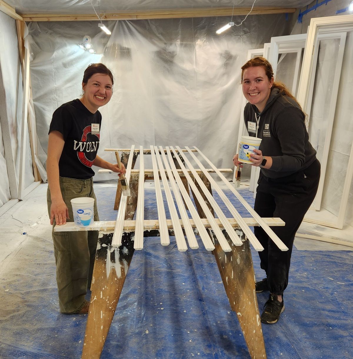 Painters using a ladder for a drying rack at Landry’s house