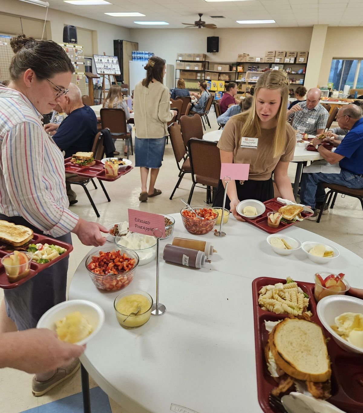 Volunteers making their own banana splits for supper