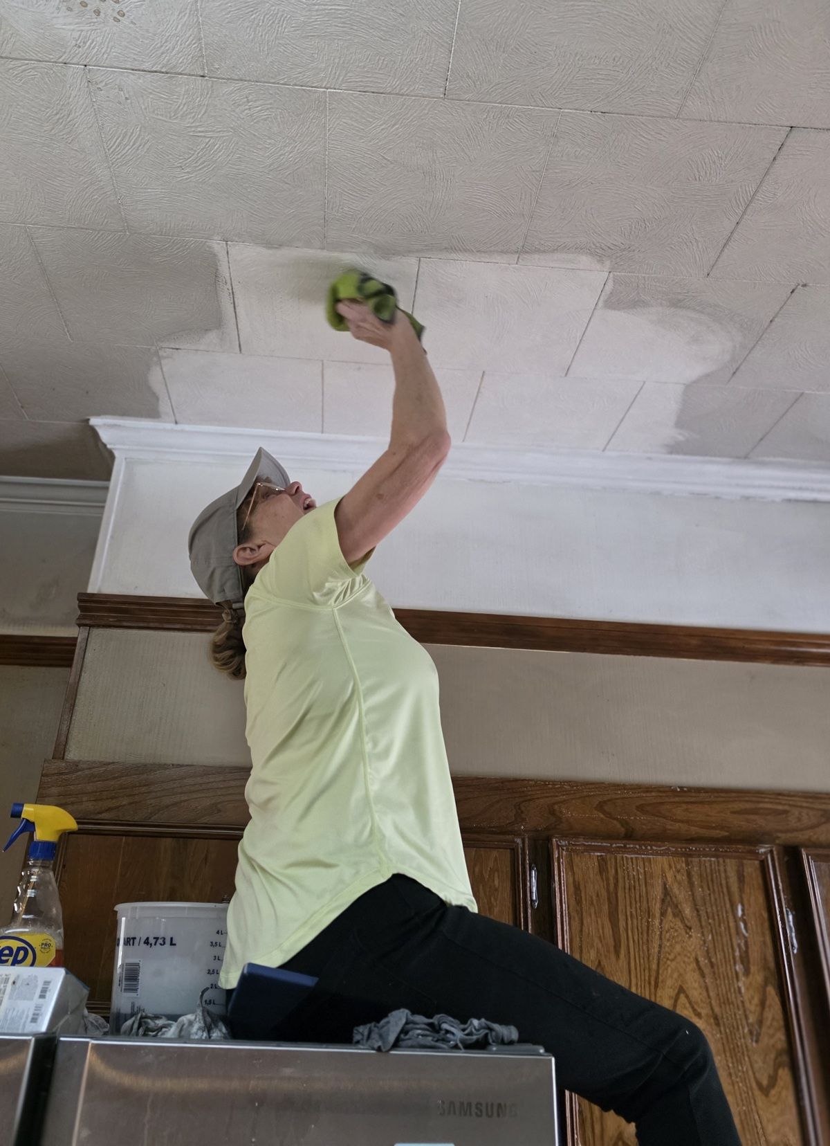 Preparing walls for paint while painting the ceiling at Lawrence’s house