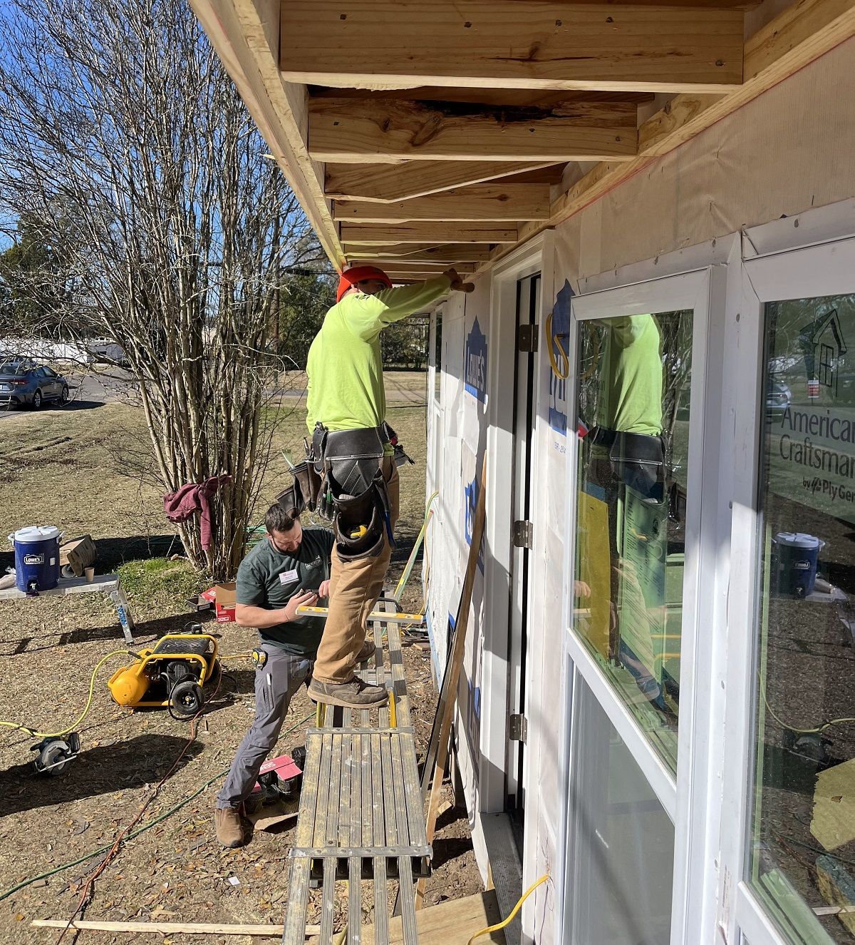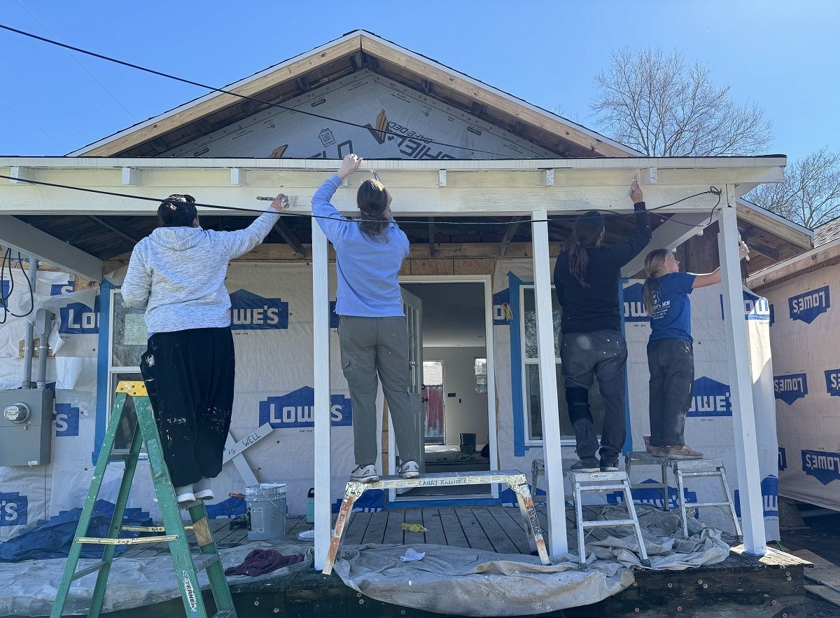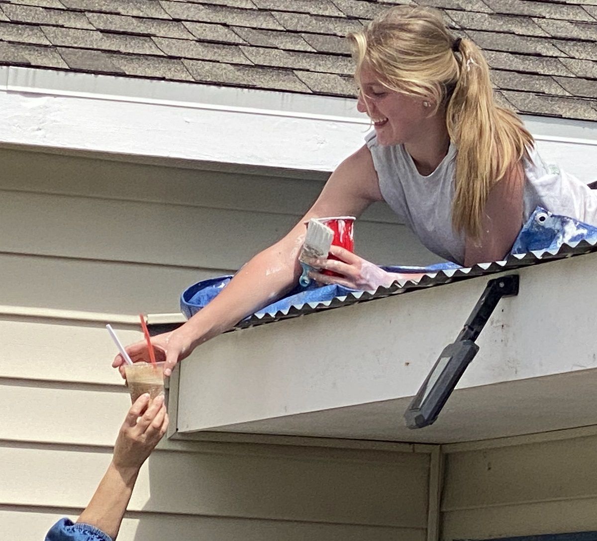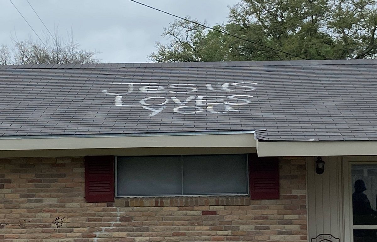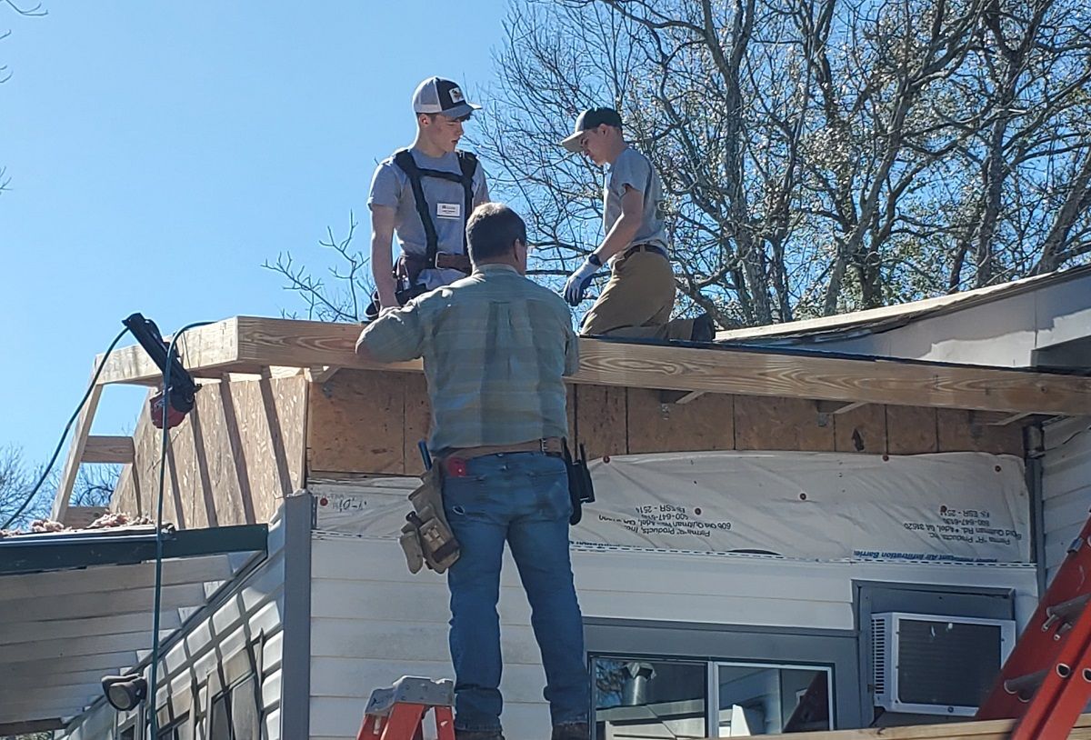 Volunteers sending a message to the neighborhood on a roof that will be replaced at Helen’s house