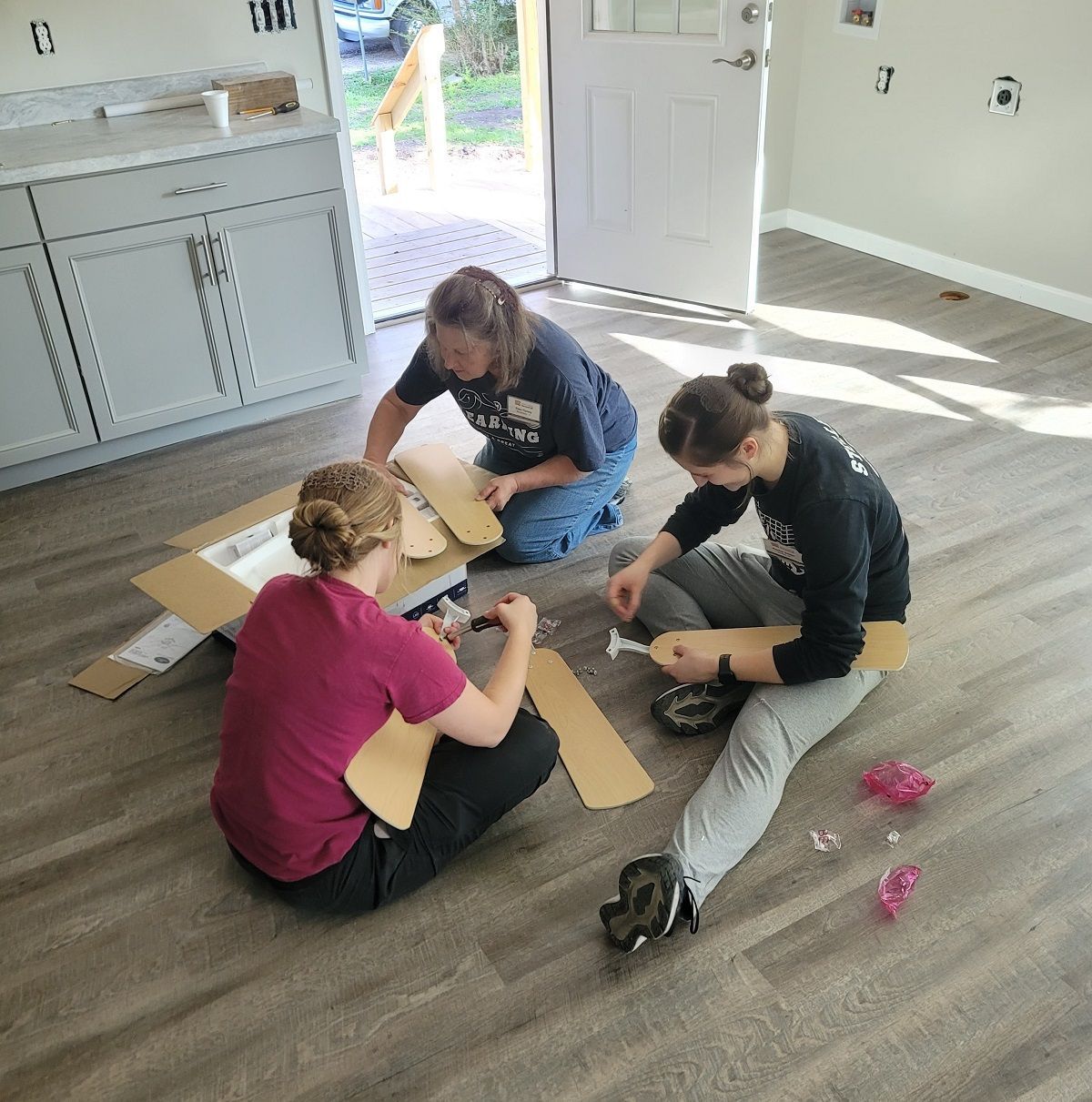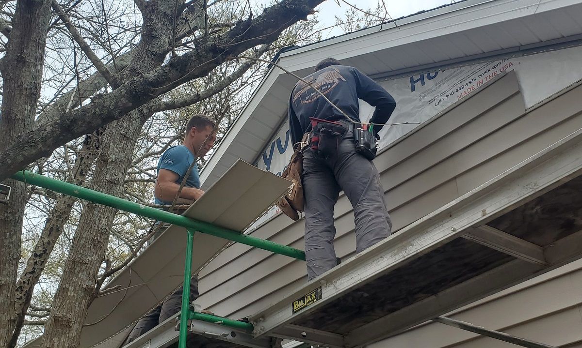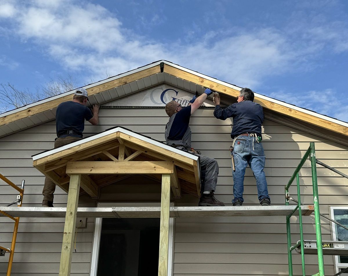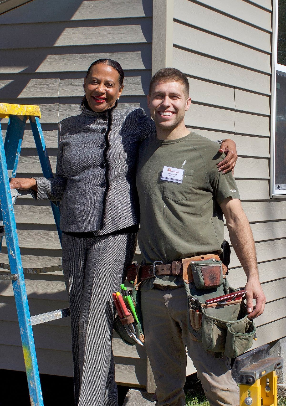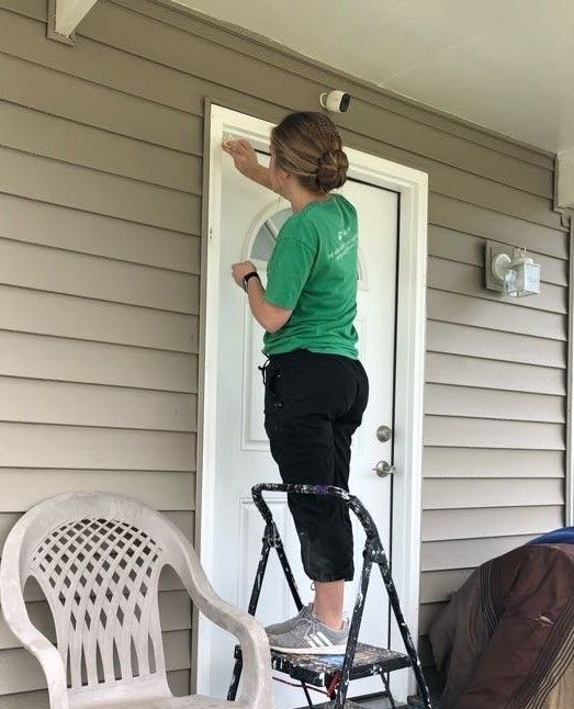 Volunteers sending a message to the neighborhood on a roof that will be replaced at Helen’s house