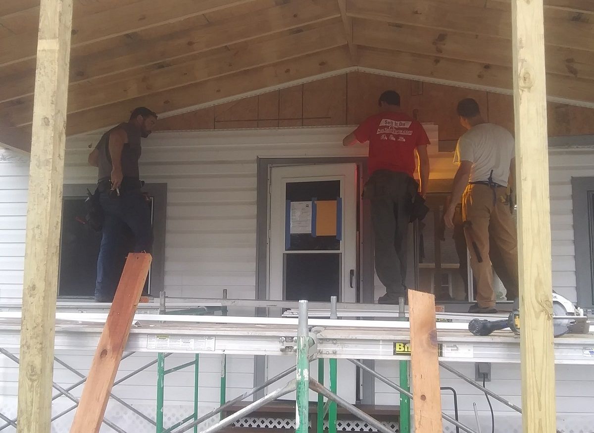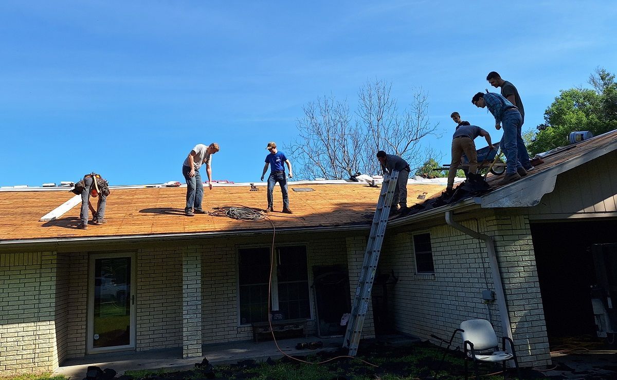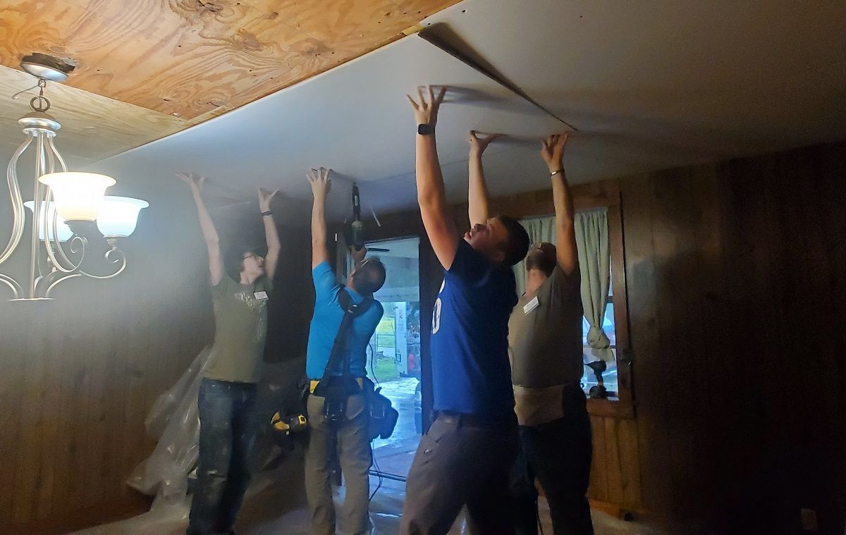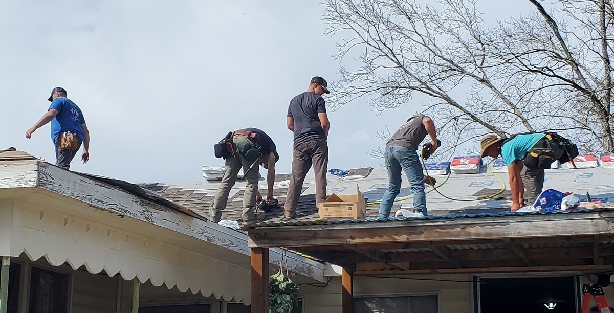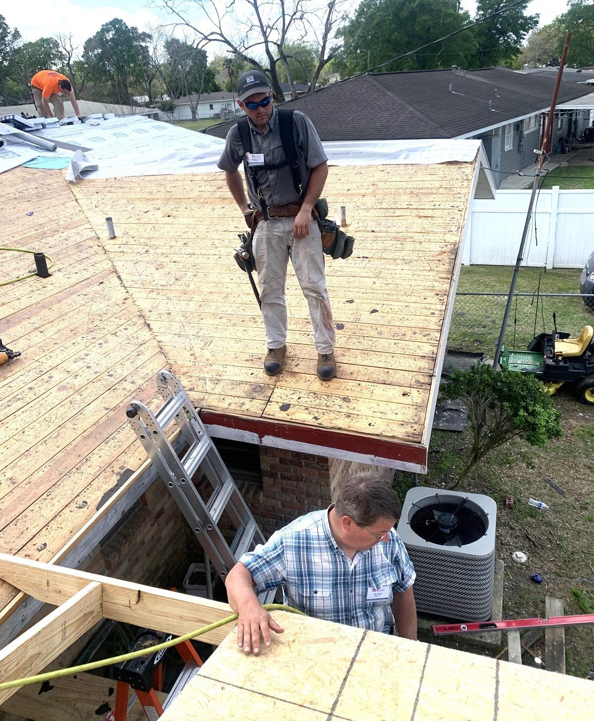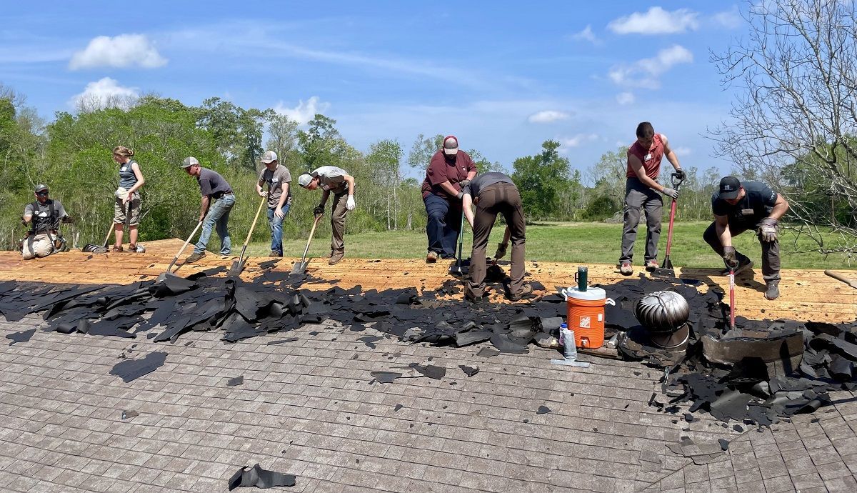 Large crew of volunteers replacing the roof on Alton and Sheila’s house