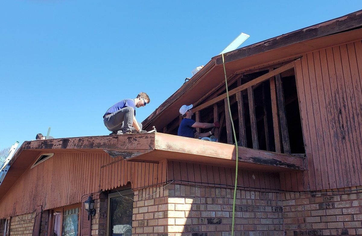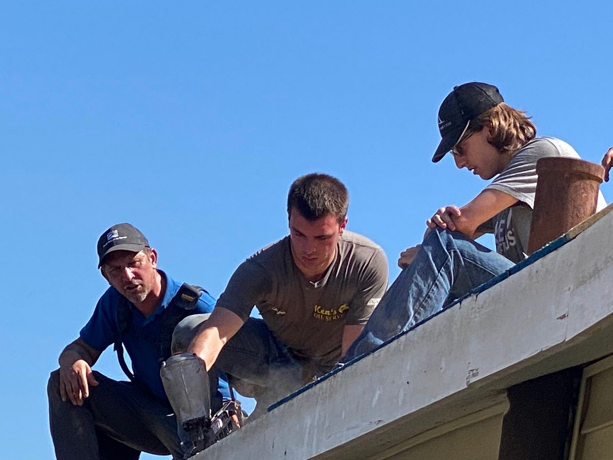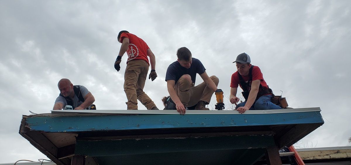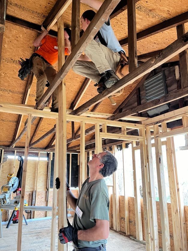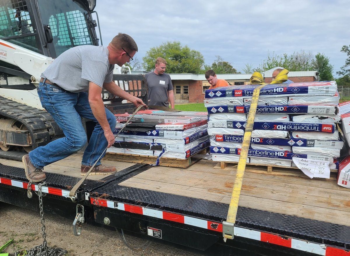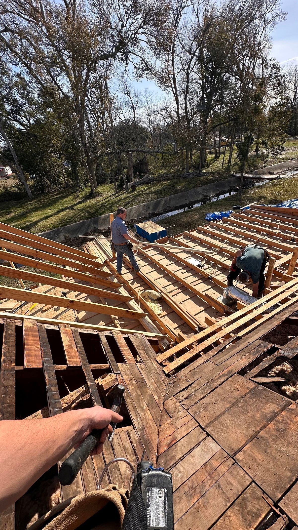 Large crew of volunteers replacing the roof on Alton and Sheila’s house