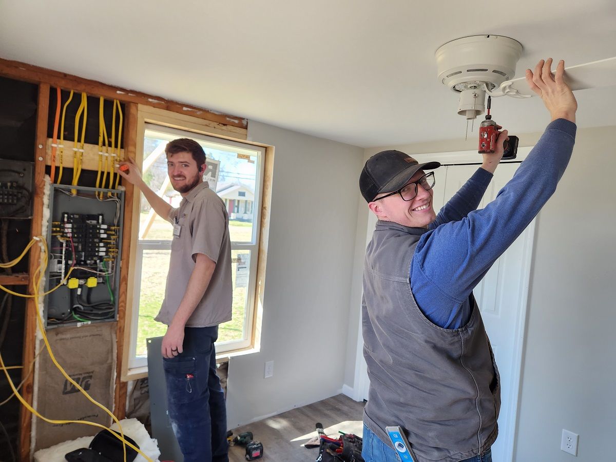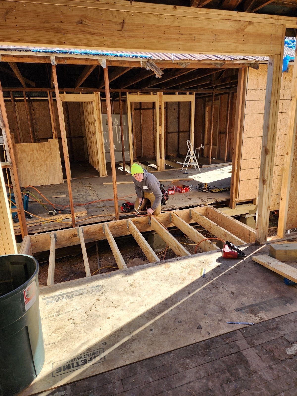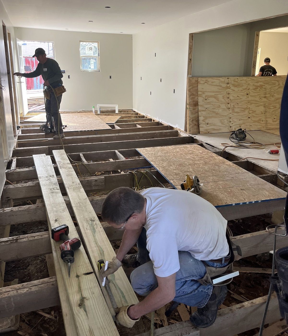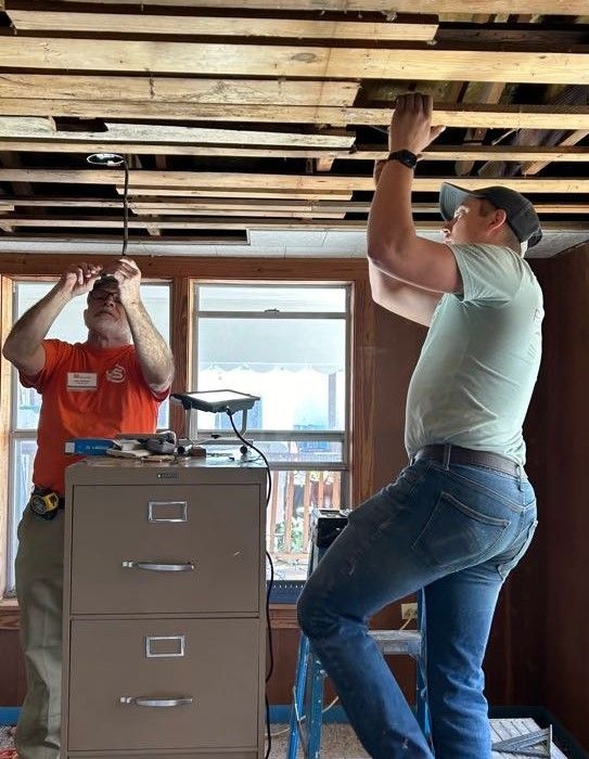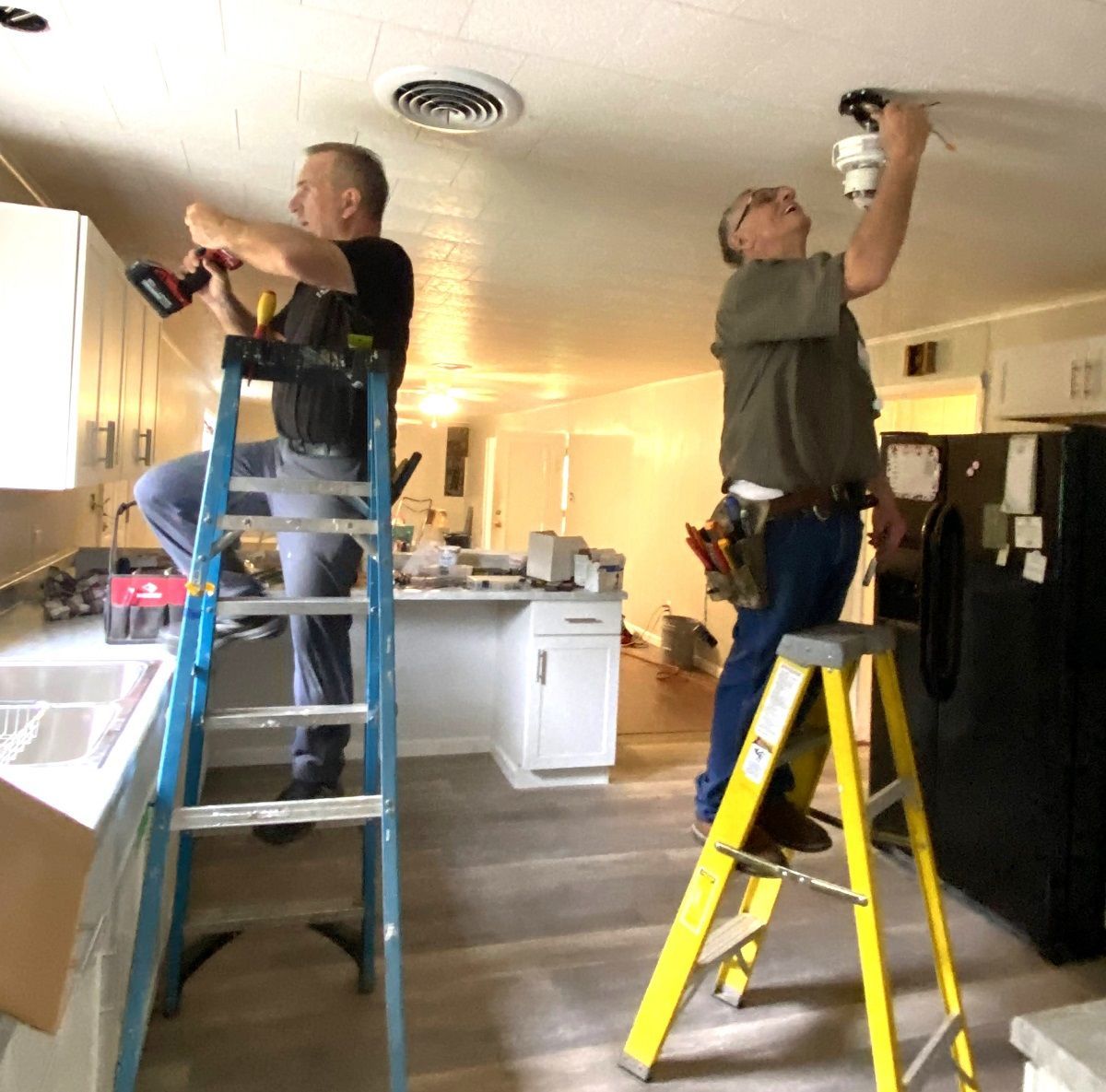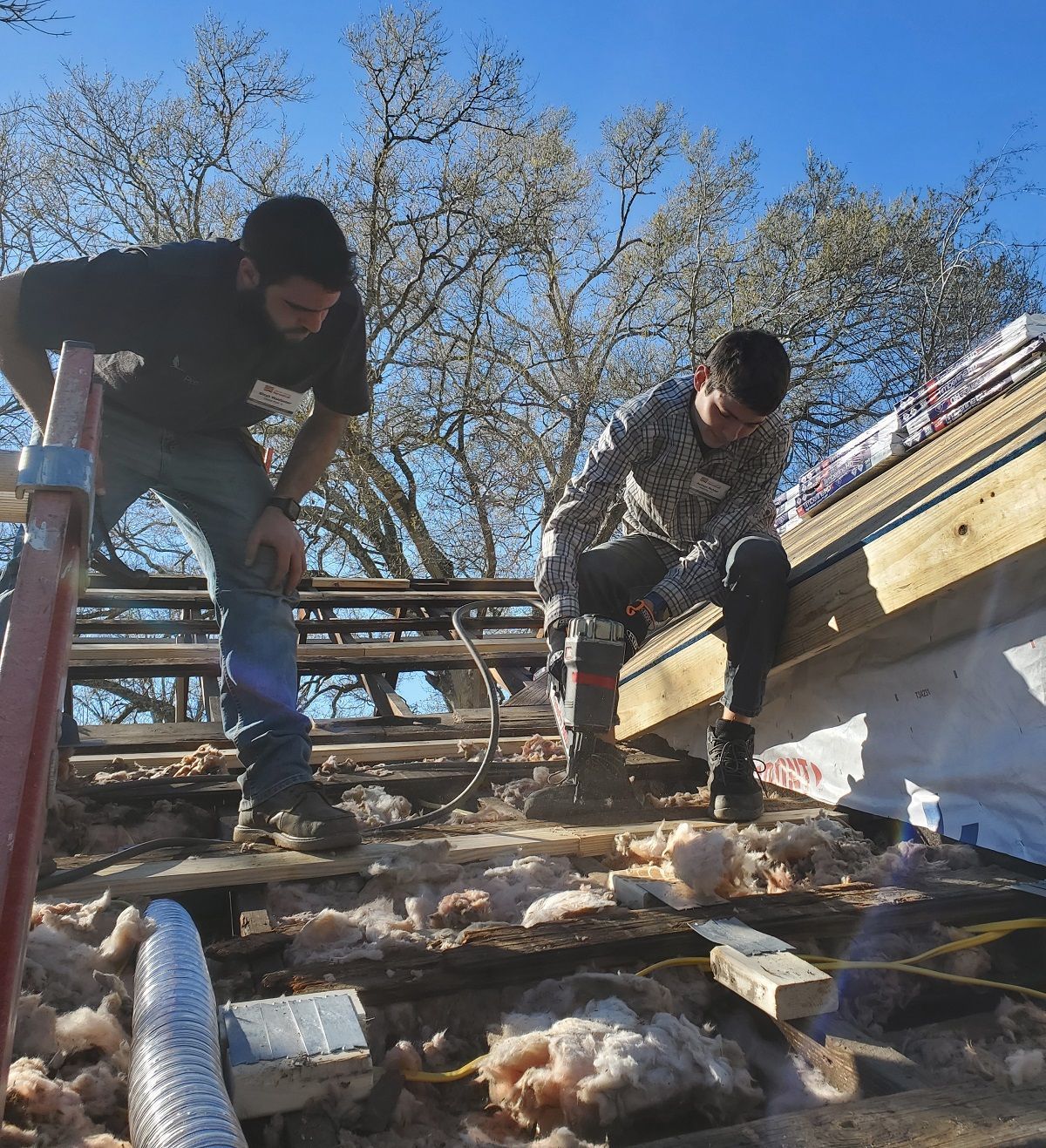 Large crew of volunteers replacing the roof on Alton and Sheila’s house