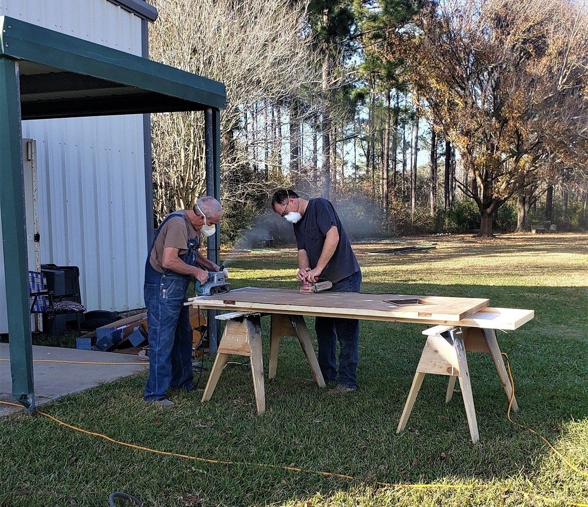 Sanding doors at the Paint and Trim shop