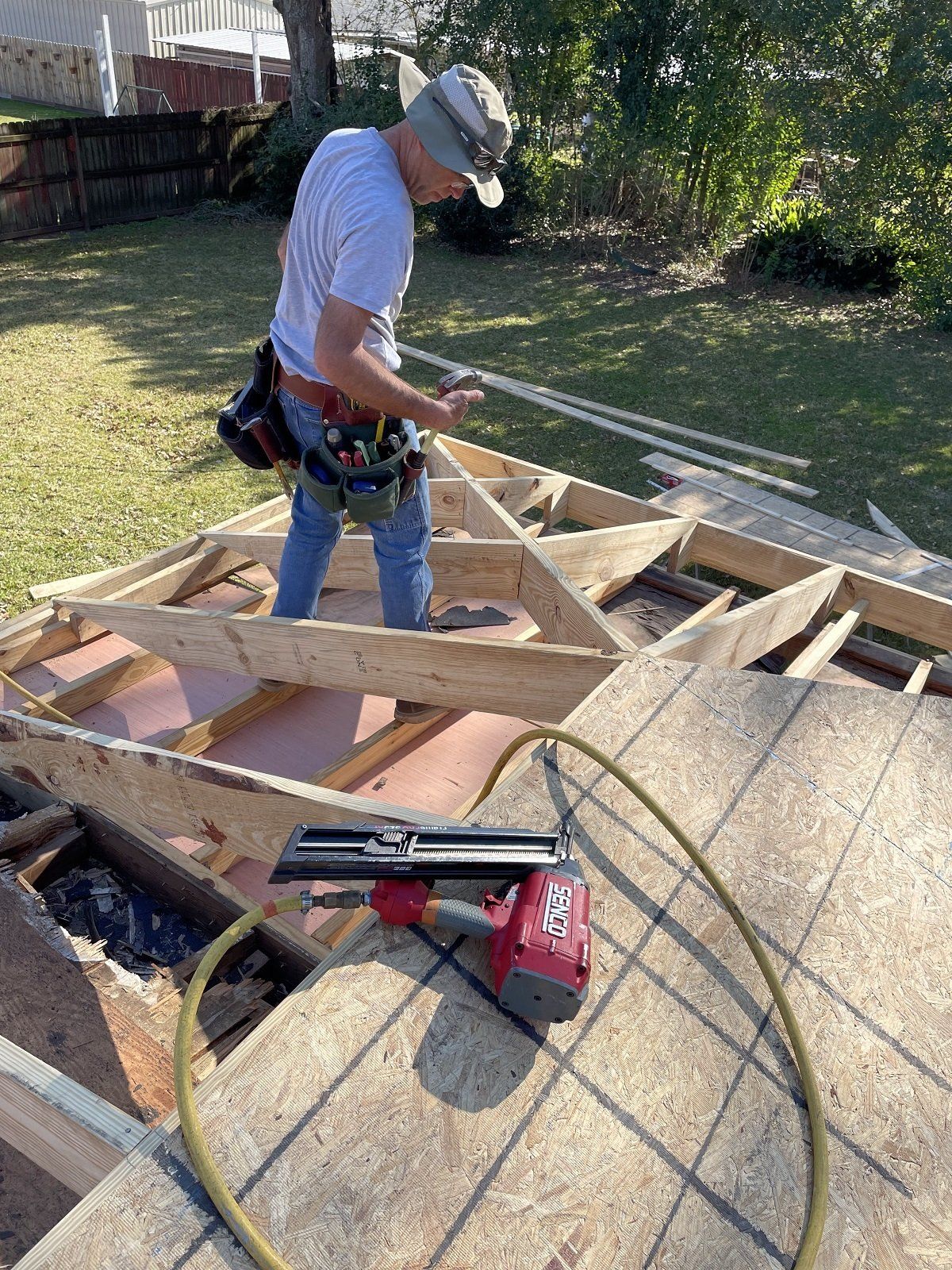 Reframing on top of an existing roof at Don and Cecelia’s house