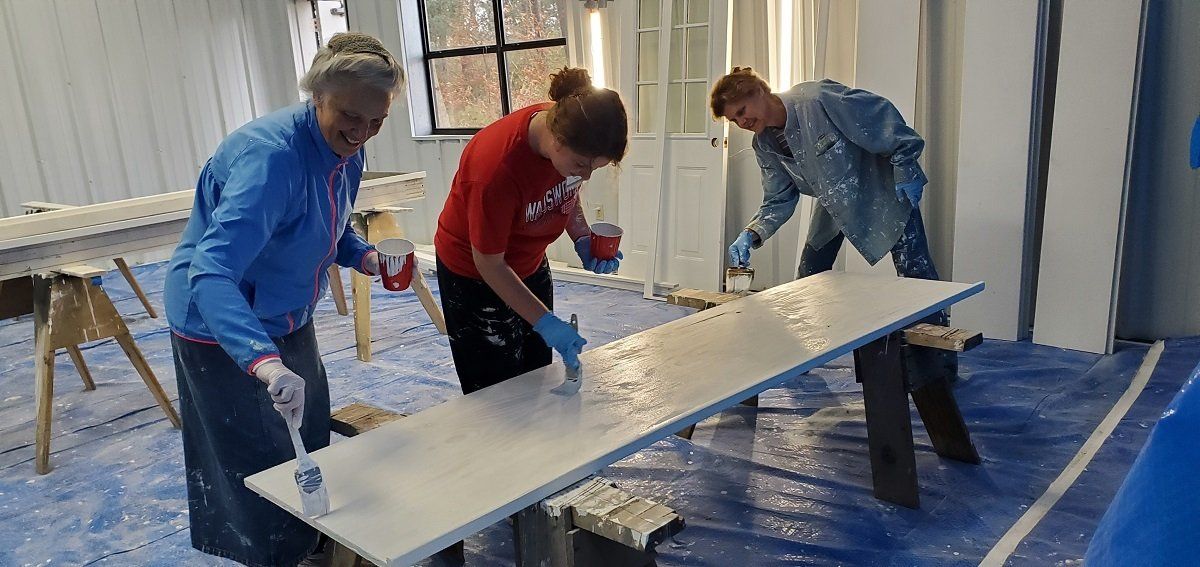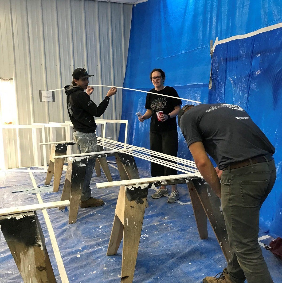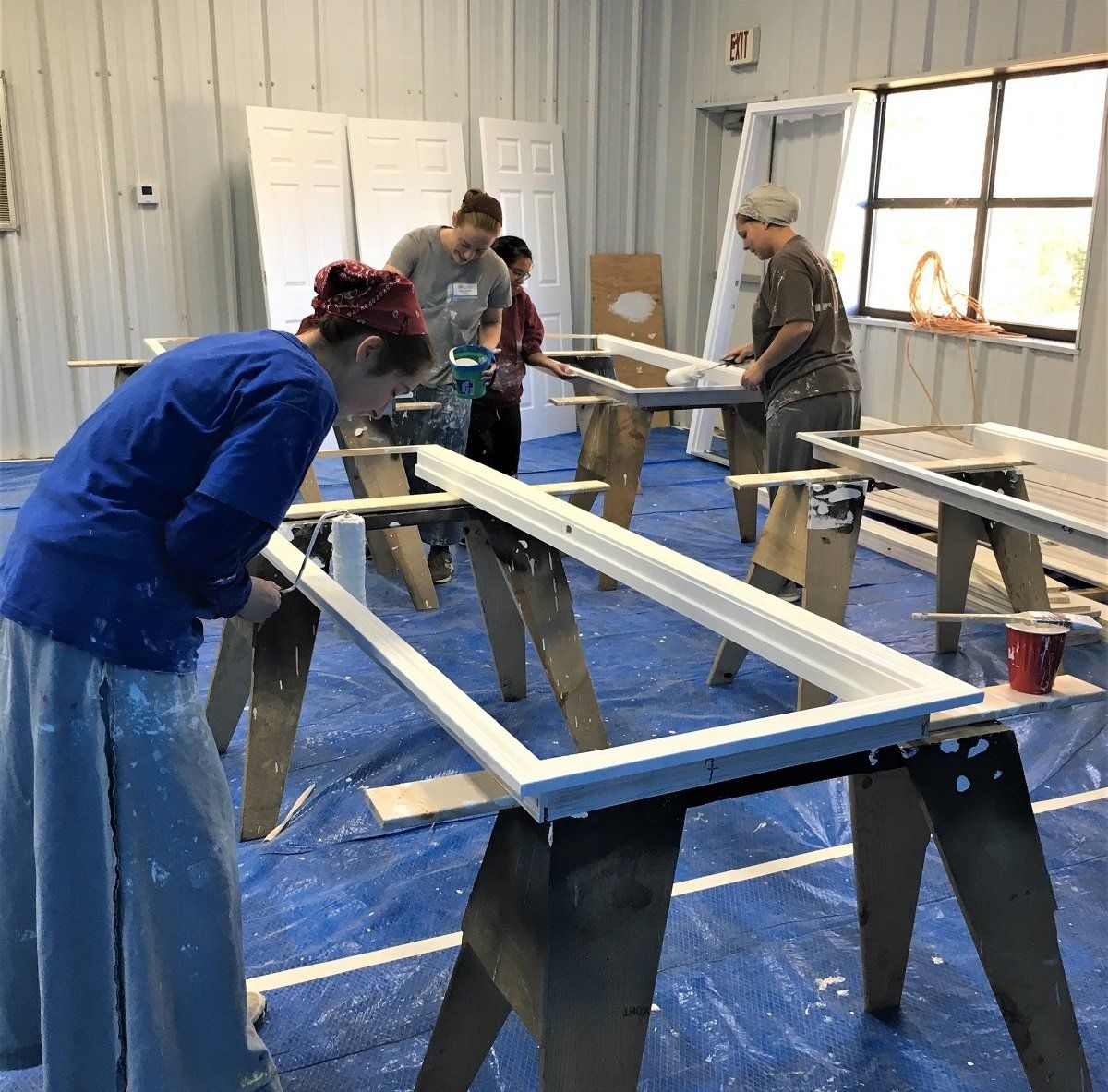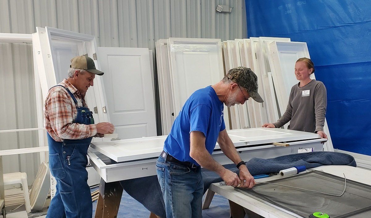 Screens being repaired and doors being prepped in the Paint and Trim Shop