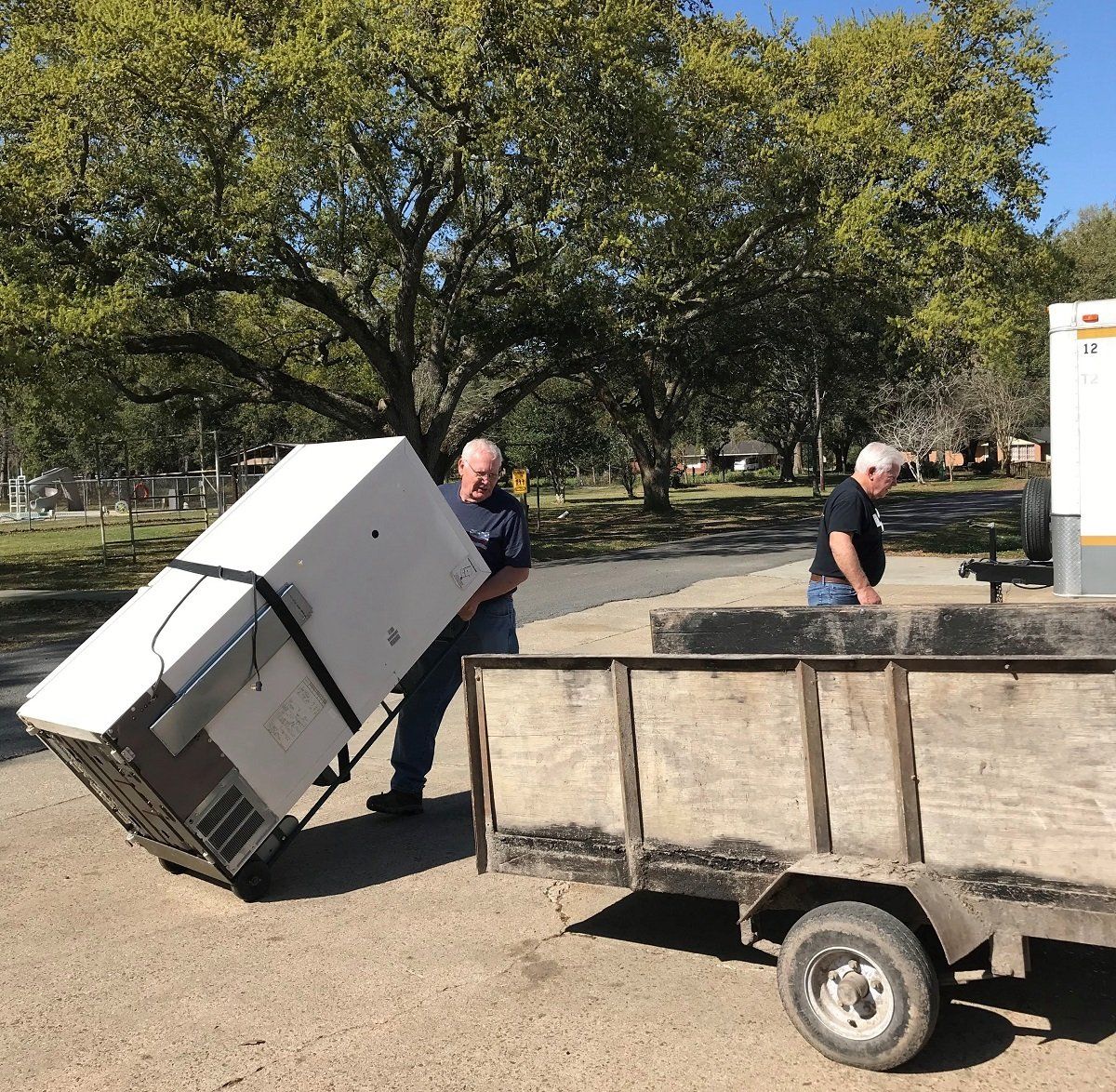 Loading the refrigerator onto the kitchen trailer