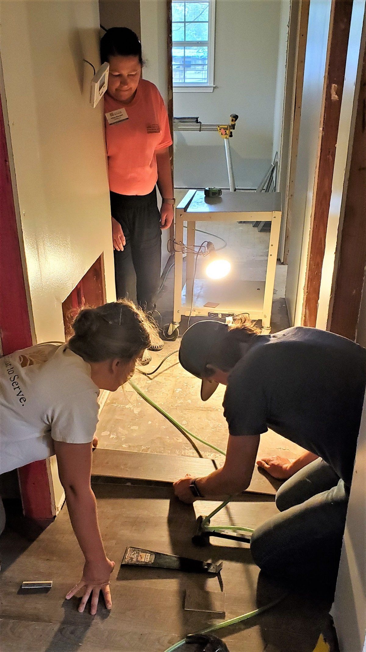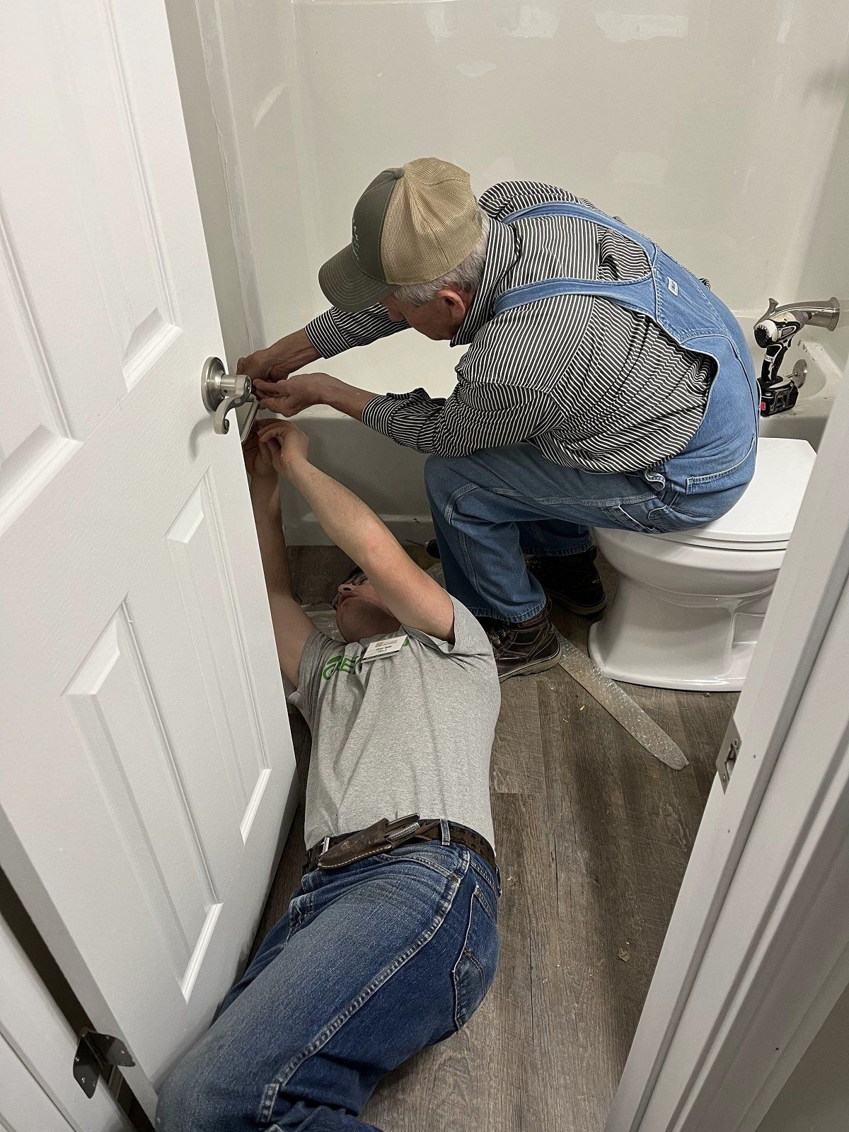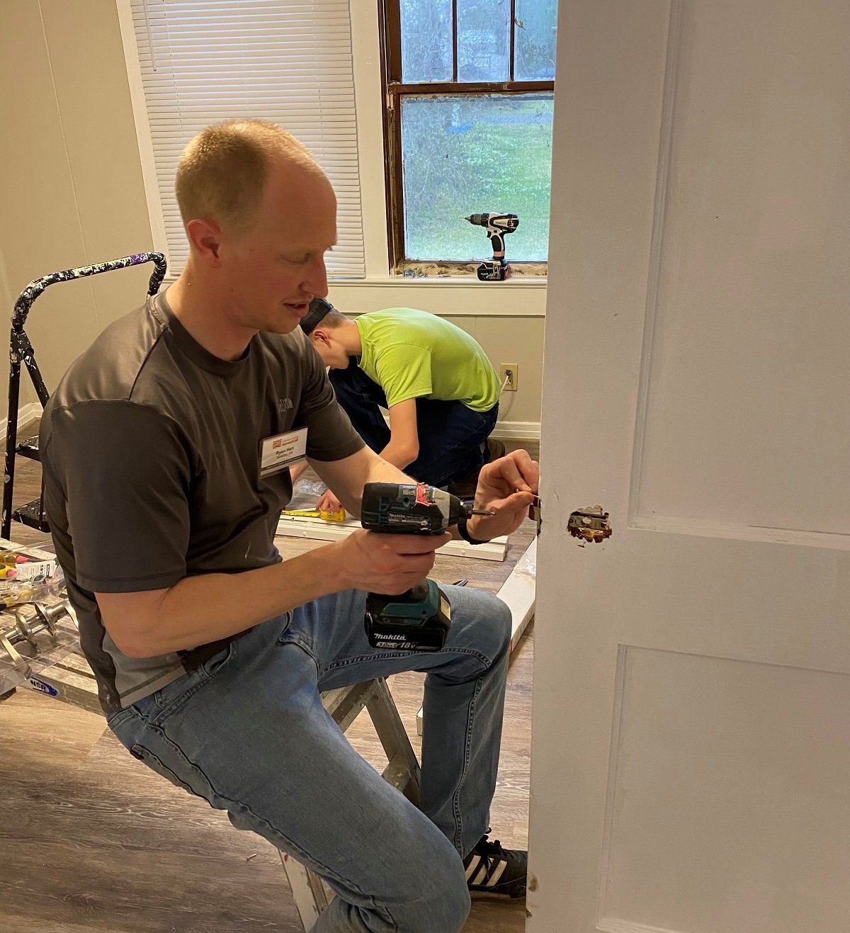 Volunteer giving attention to door knob installation