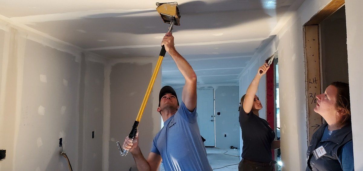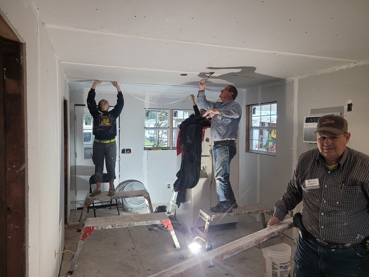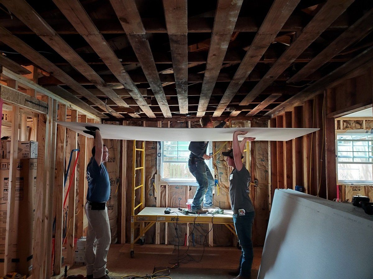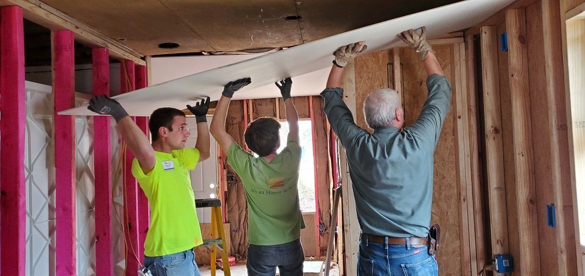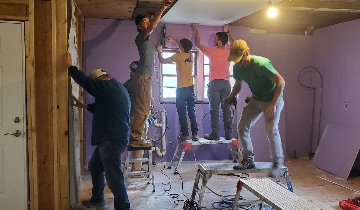Volunteers taping drywall at Jacqueline’s house