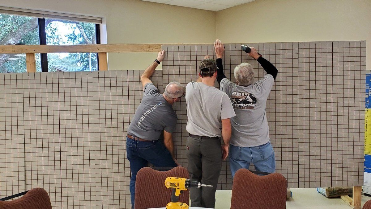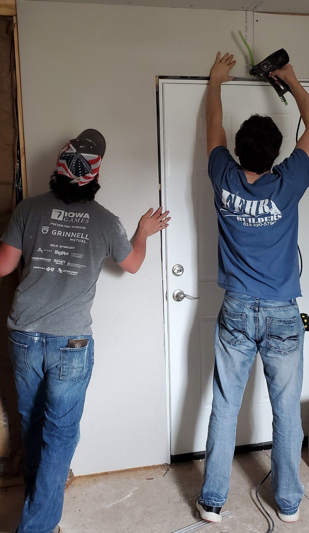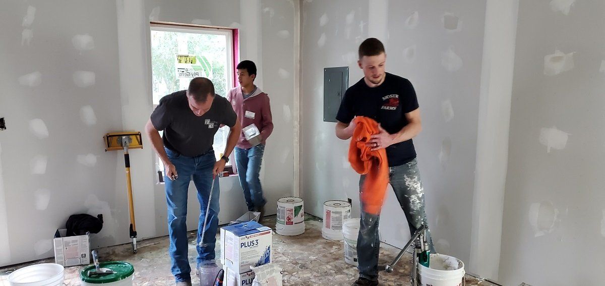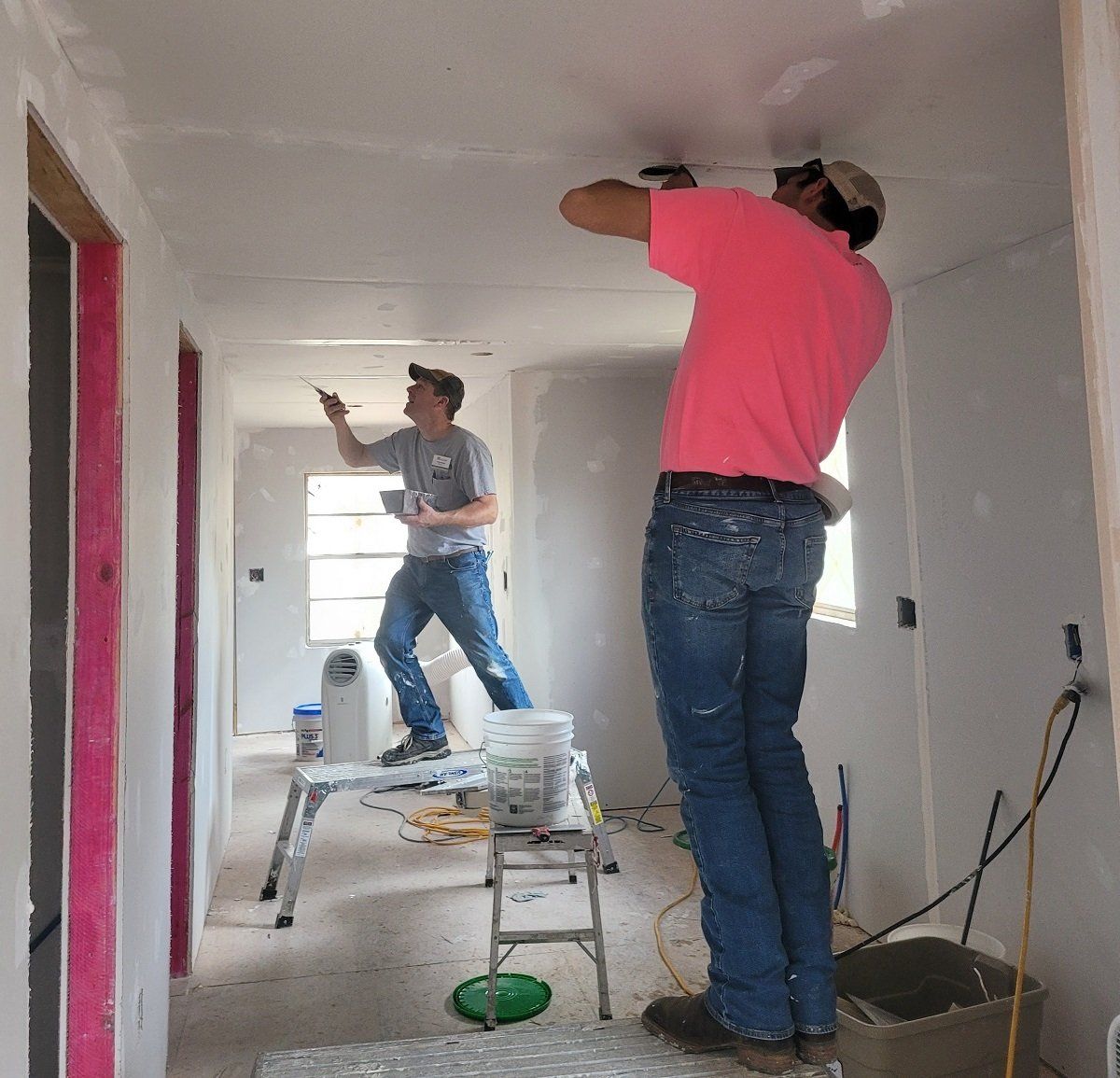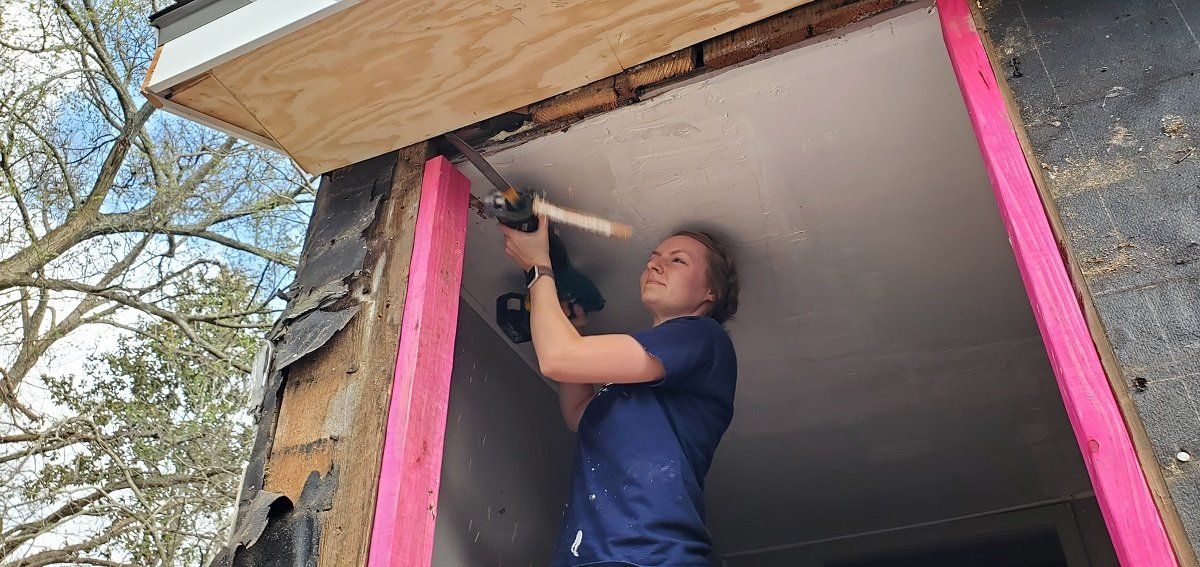 Volunteers taping drywall at Jacqueline’s house