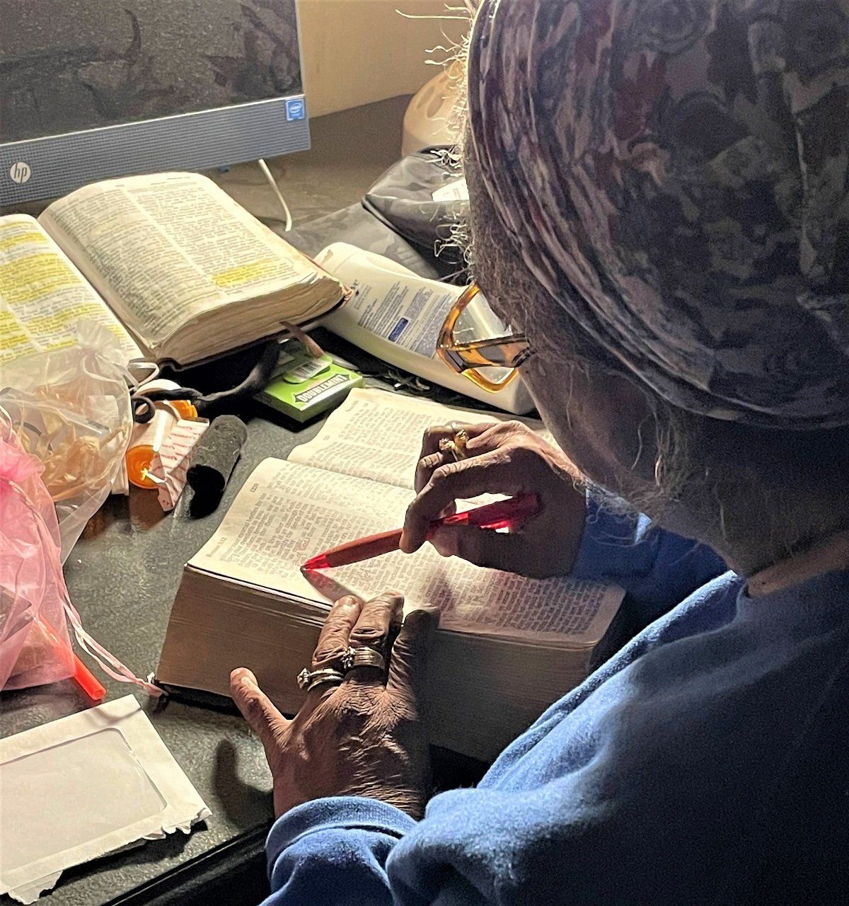 Cecelia doing her Bible studies and reading each dayv