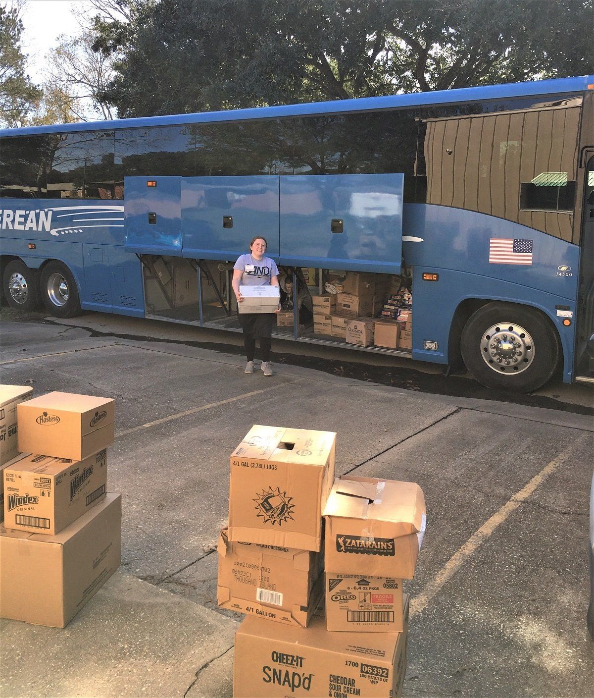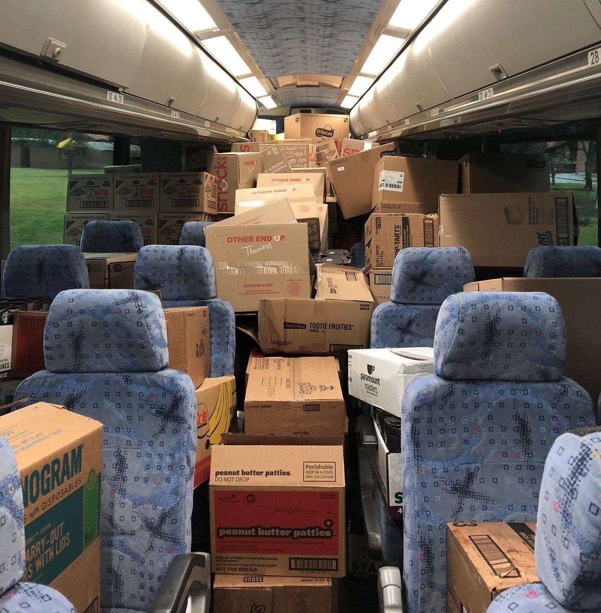 Unloading supplies from the bus donated by Midwest Food Bank