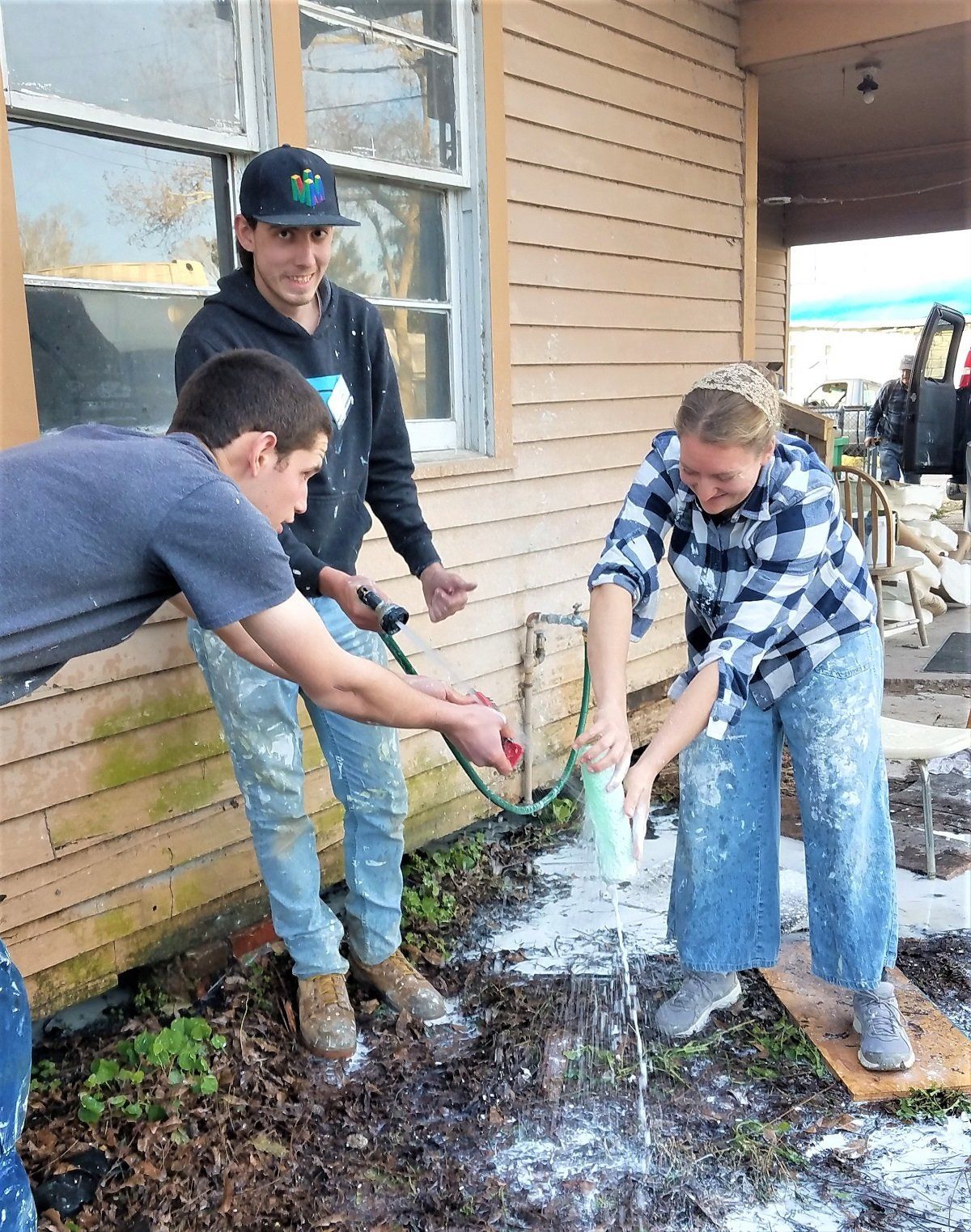 Cleaning paint rollers and brushes at Nadine’s house