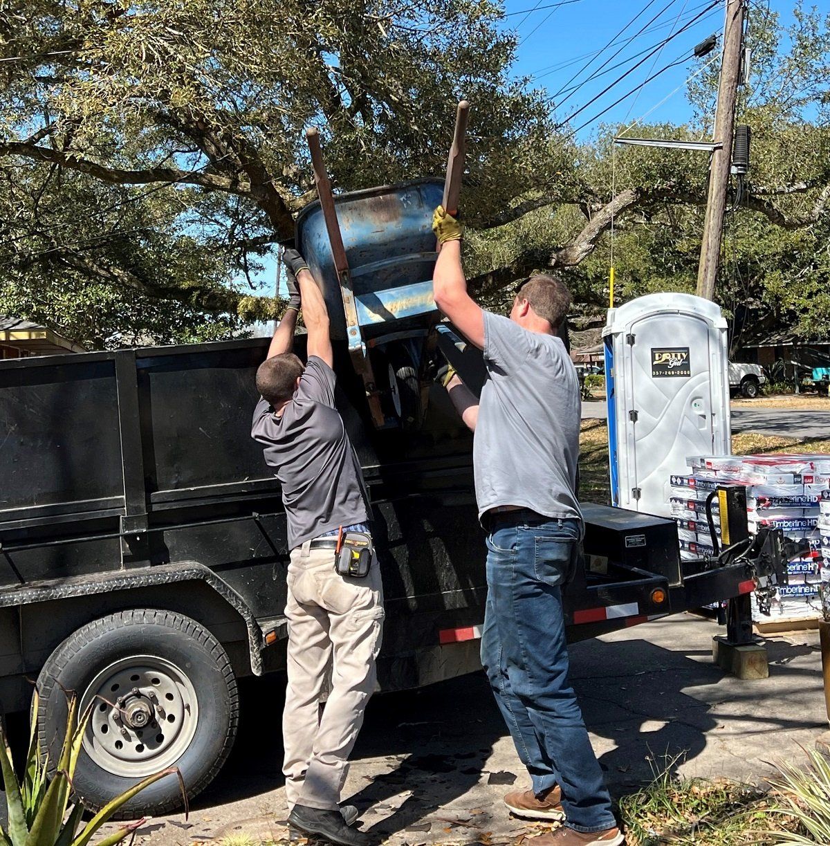 Team work in emptying roof debris in dumpster