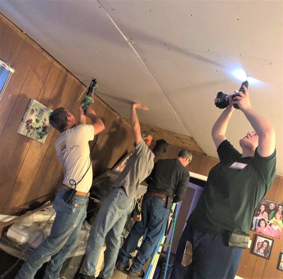 Installing drywall on the ceiling at Nadine’s house