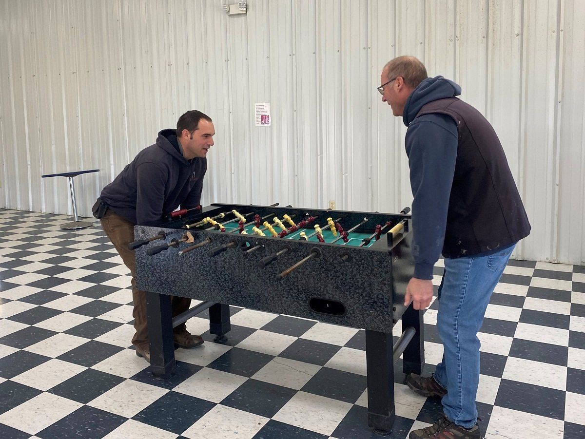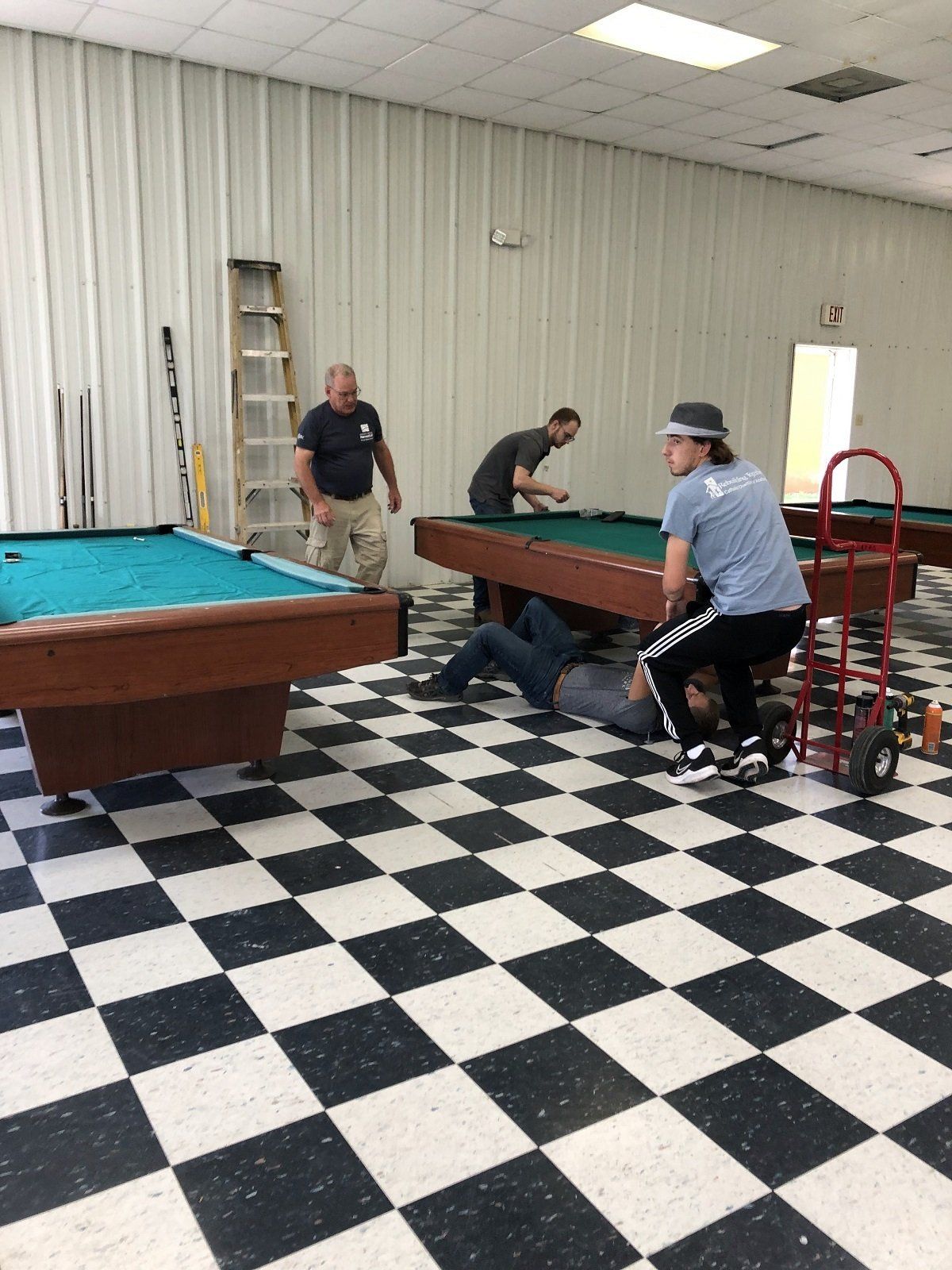 Reassembling pool tables in the area that we use for the paint and trim shop