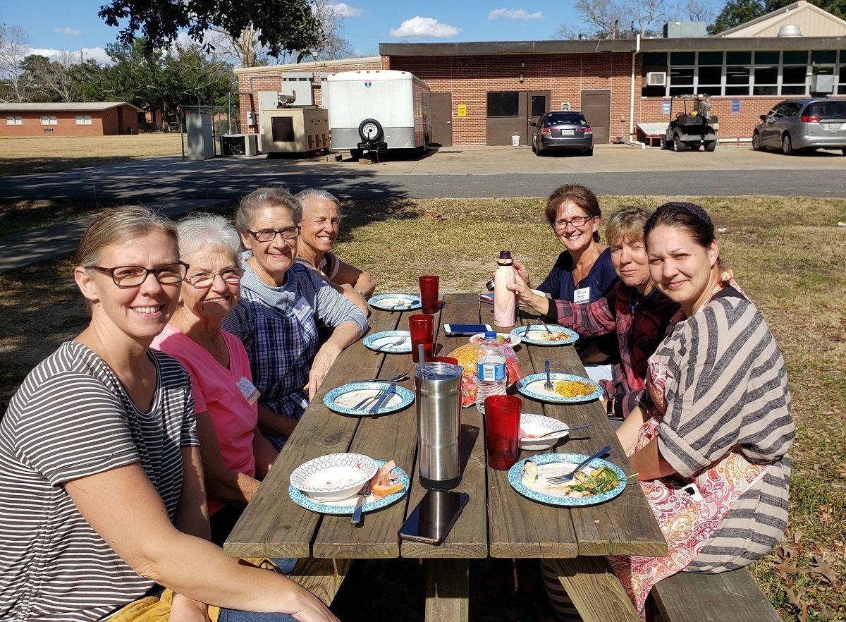 Ladies serving in the kitchen enjoying a lunch break outside