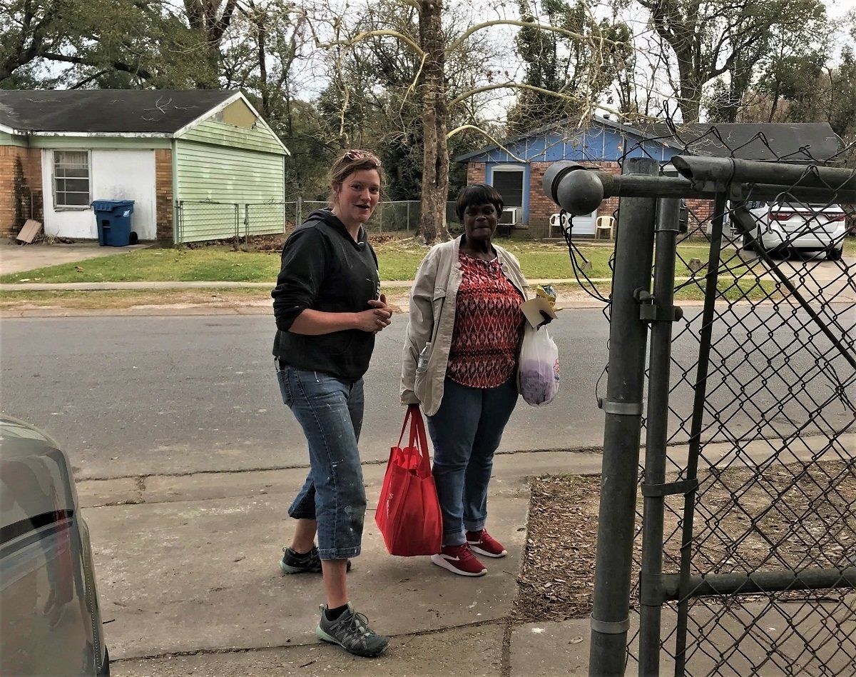 Giving a blessing bag to one of Gwen’s neighbors