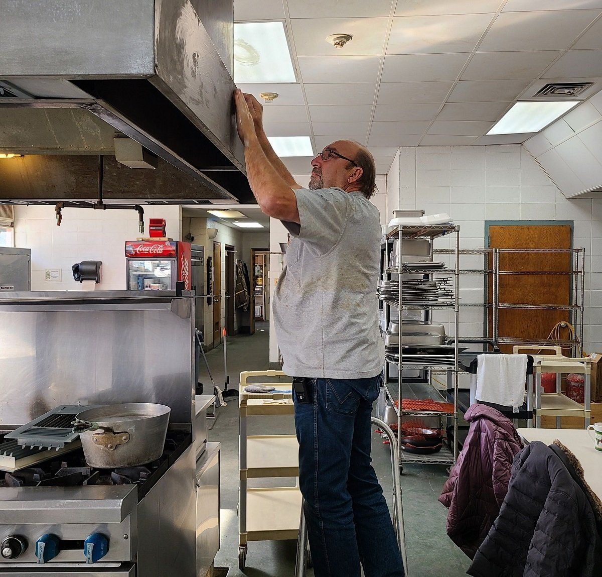 Final scrubbing of the commons area in the dorm building