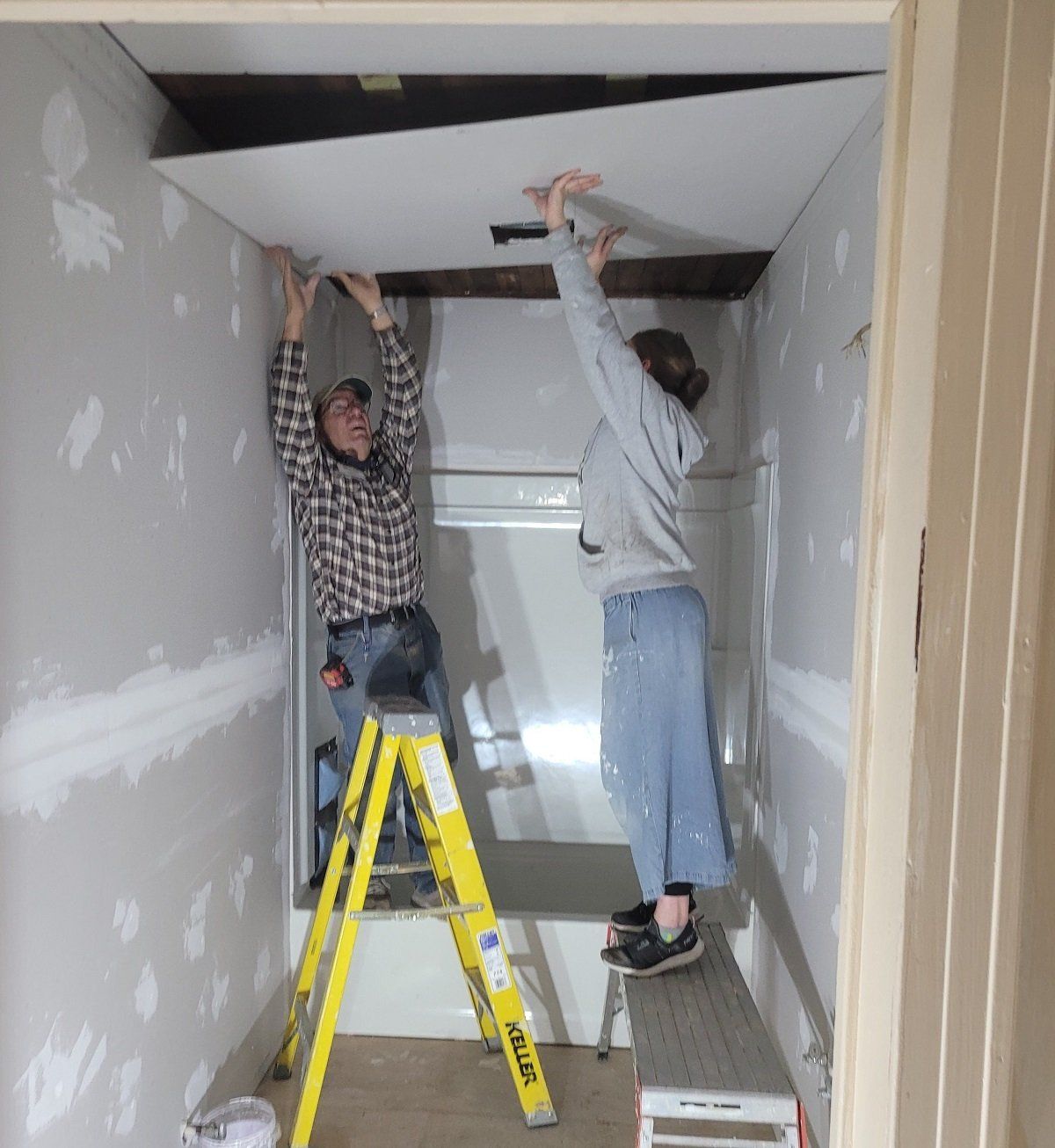 Sheets of drywall going on Jacqueline’s ceiling